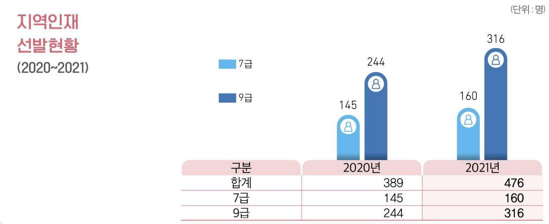 출처: 인사혁신처, 2022 공공부문 균형인사 연차보고서 중앙정부는 특성화고 등 지역인재 9급 수습직원 선발, 지역인재 7급 수습직원 선발 제도 확대 등을 통해 2020년 대비 2021년 채용 인원이 크게 증가한 것을 살펴볼 수 있습니다. 이와 같은 지역인재 채용으로 정부는 지역대표성을 강화할 수 있을 것으로 기대하고 있습니다. 공공기관도 지방이전 공공기관의 연도별 지역인재 의무채용 비율을 2022년까지 30% 의무화함에 따라 지방 이전하는 많은 기관들이 지방인재를 채용하고 지역대표성을 강화하기 위해서 지속적으로 노력하고 있습니다.
