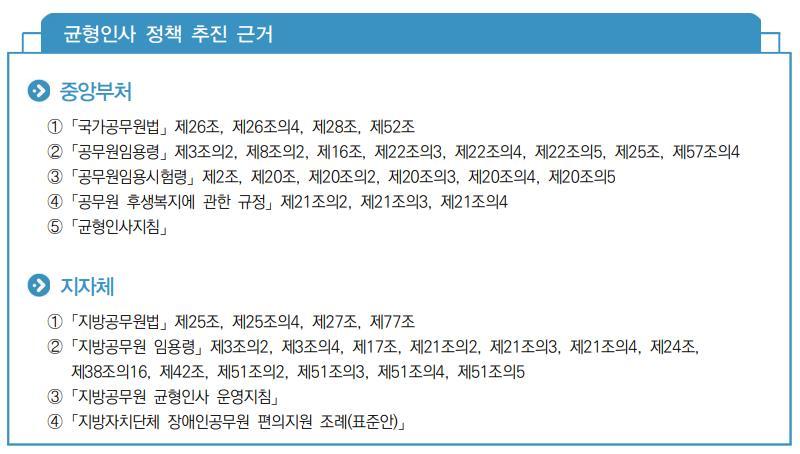 중앙정부와 지방자치단체는 2005년 『국가공무원법』, 2007년 『지방공무원법』을 개정하여 균형인사 정책 수행을 위한 법적근거를 마련하였습니다. 또한 2008년에는『균형인사지침』을 제정하여 균형인사 정책 수행에 필요한 세부 가이드라인을 마련하였습니다(2022, 인사혁신처).