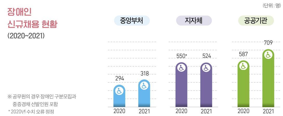 그 결과 2021년 장애인 신규채용 실적이 지방자치단체는 주춤하였지만 중앙부처는 2020년 대비 8.16% 증대되었습니다. 공공기관 2021년 장애인 신규채용 실적의 경우에도 장애인 제한경쟁, 장애인 채용 시 우대 정책 등을 통해 2020년 대비 20.78% 증대되었습니다.