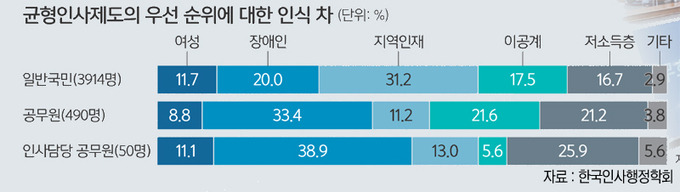 이와 함께 균형인사제도의 우선순위 논의 또한 이루어져야 합니다. 위 그래프에서 확인할 수 있는 바와 같이 인사행정학회가 2021년 8월 일반국민 3,914명과 중앙부처 공무원 490명, 인사담당 공무원 50명을 대상으로 설문조사한 결과에 따르면 일반국민, 공무원, 인사담당 공무원 간 균형인사제도 우선순위에 대해 인식차가 있는 것으로 나타났습니다. 균형인사의 궁극적 목표가 국민에 대한 대표성과 대응성 강화에 있음을 생각해 보았을 때 일반국민과 공무원 간 균형인사제도 인식의 간극은 반드시 극복되어야 할 문제입니다.