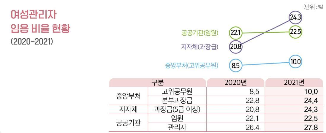 출처: 인사혁신처, 2022 공공부문 균형인사 연차보고서 ‘18년 내 모든 중앙부처에 여성 고위공무원 1명 이상 임용을 추진, 고위공무원 후보자 2~3 배수 추천 시 양성 모두 포함 원칙 시행, 중앙선발시험위원회 여성위원 비율 확대 실시 등으로 ‘21년 고위공무원단 여성 10%, 본부 과장급 여성 24.4%를 달성하였습니다. 이외에도 육아휴직 경력인정 확대, 모성보호시간 확대, 부부 동일거주 지역을 위한 보직관리 원칙 등을 통하여 여성이 일과 생활 내에서 균형을 유지할 수 있도록 근무조건을 개선하고 있습니다(인사혁신처, 2018).