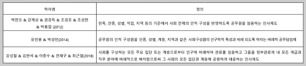 대표관료제를 처음 제안한 사람은 킹슬리(D. Kingsley)입니다. Kingsley는 실적주의(실적주의: 공무원의 능력, 성적, 자격 만을 기준으로 평가하는 주의)의 책임성 부족에 대해서 공감하고 이를 보완하기 위한 방법으로 대표관료제 도입을 주장하였습니다. 대표관료제(representative bureaucracy)는 정부 조직을 지역, 성별 등 사회구성원의 인구통계학적 비율에 맞춰서 구성하며 이를 통해 각 이해 집단의 이해관계가 공정하게 반영될 수 있게 하려는 조직을 의미합니다(최창현, 2019). 대표관료제 도입을 옹호하는 사람은 관료제 내 인종, 출신지역, 성별 등이 사회구성원의 인구통계학적 특성을 반영하여 구성될 경우 관료제 대표성과 책임성이 증진됨을 강조합니다. 대표관료제의 학자별 정의는 크게 다르지 않으며 대표관료제에 대한 학자별 정의를 살펴보면 다음과 같습니다.