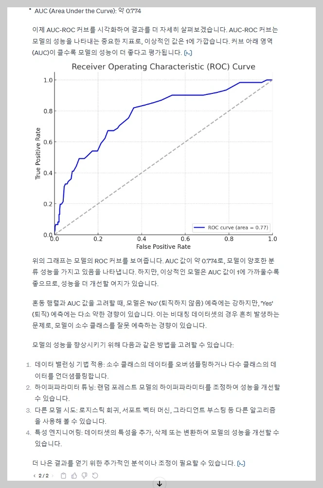 다음으로 mrc03의 Github 홈페이지에 업로드 되어 있는 IBM HR Data를 분석해 보고자 합니다. 이 데이터는 HRKIM 브런치에서도 여러번 활용한적 있었습니다. Chat GPT_Data Anlysis에게 GitHub 소스코드를 탑재하고 퇴직 예측 분석을 실시해 달라고 요청하였습니다. 요청 결과 Chat GPT Data Analysis 내에서 퇴직 예측 분석이 잘 이루어짐을 아래 화면을 통해 확인할 수 있었습니다.