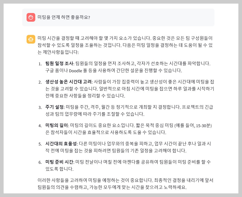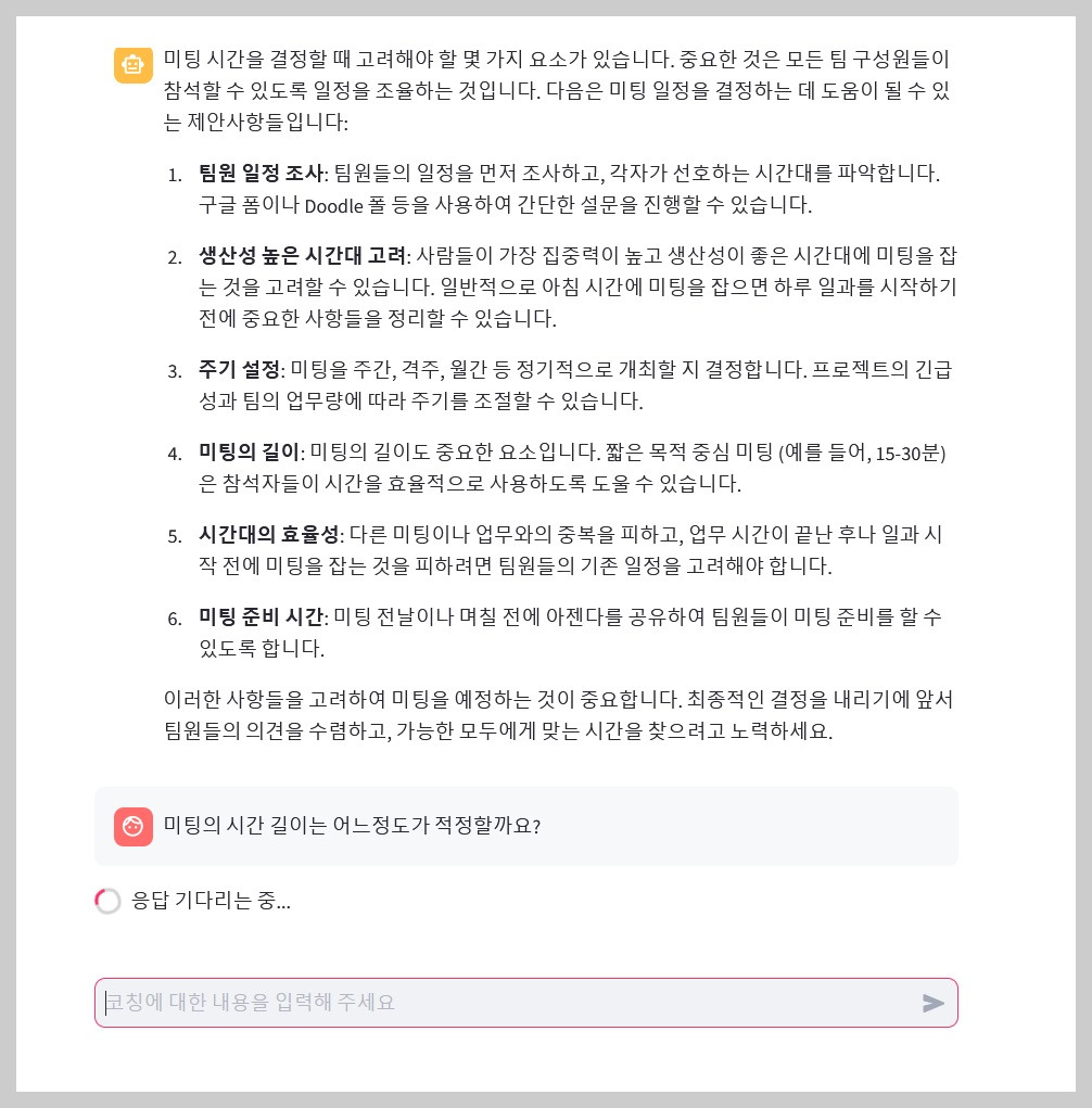 해당 파일을 저장한 후에 다음과 같은 명령어로 실행하면 챗봇을 사용할 수 있습니다.