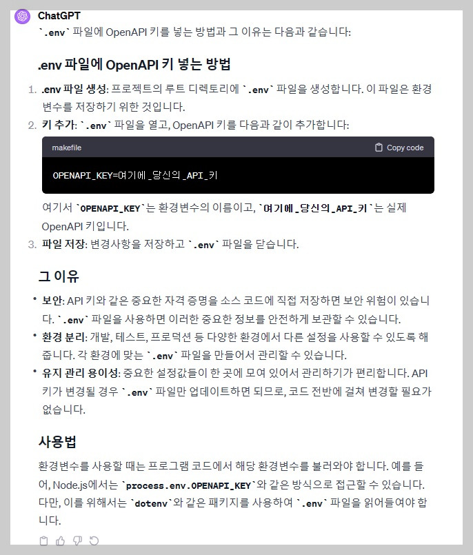 먼저, OpenAI API 키를 설정하는 방법입니다. Python 프로젝트를 진행하는 폴더 내에 .env 파일을 새로 생성합니다. 이 파일에 OpenAI API 키를 저장합니다. 하단 오른쪽에 위치한 ChatGPT의 안내에 따라 API 키를 입력하시면 됩니다.