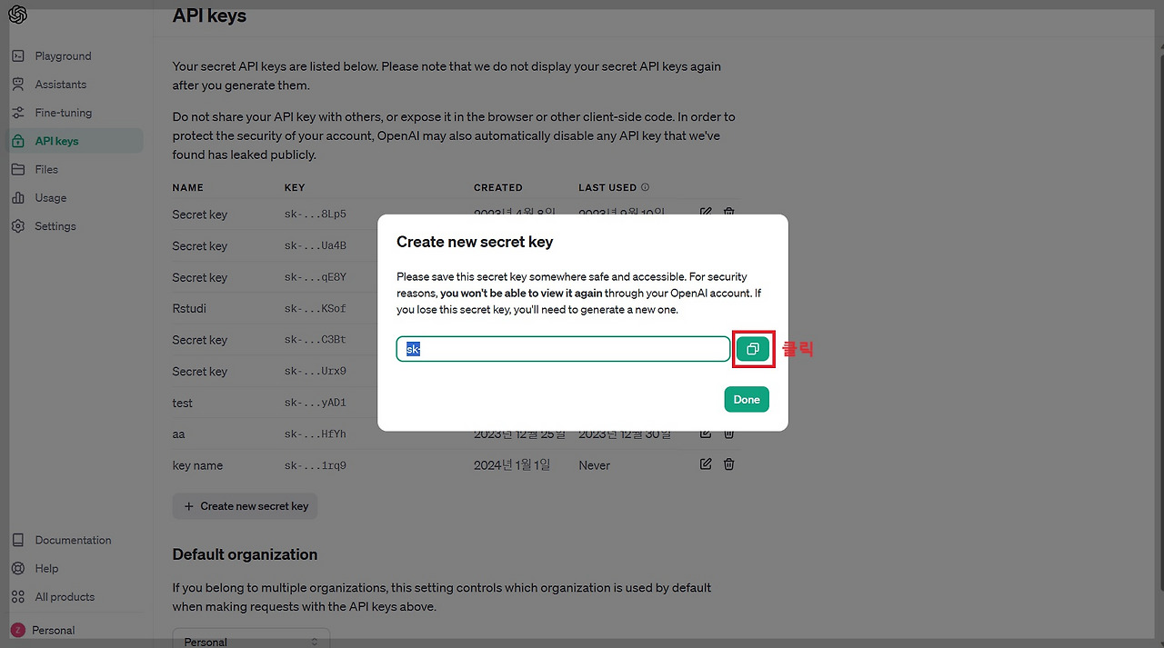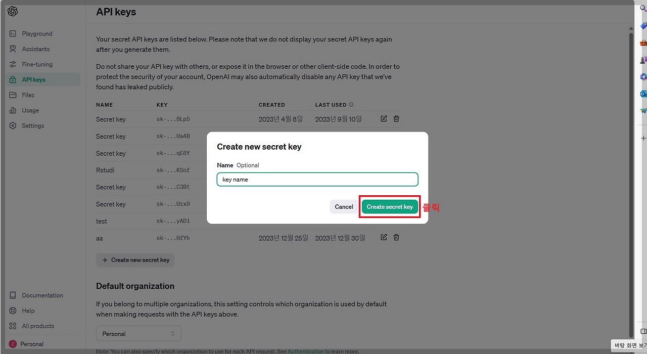 위에서 살펴볼 수 있는 바와 같이 좌측에 [API keys] 메뉴를 클릭한 후 [+Create new secret key] 버튼을 클릭합니다. 해당 버튼을 클릭하면 하단 좌측처럼 화면이 활성화됩니다. Name에 원하는 API Key 이름을 넣고 [Create secret key] 버튼을 클릭하면 sk-로 시작하는 OpenAI key가 발급이 됩니다. 해당 key는 오른쪽 복사 버튼을 클릭해서 복사한 후 메모장 같은 곳에 저장해 주시기 바랍니다(발급된 후에 홈페이지 상에서는 Key를 다시 볼 수 없으니 반드시 메모장에 복사해 주세요.). 해당 키는 뒤 Python으로 챗봇 구현하기 부분에서 사용할 예정입니다.