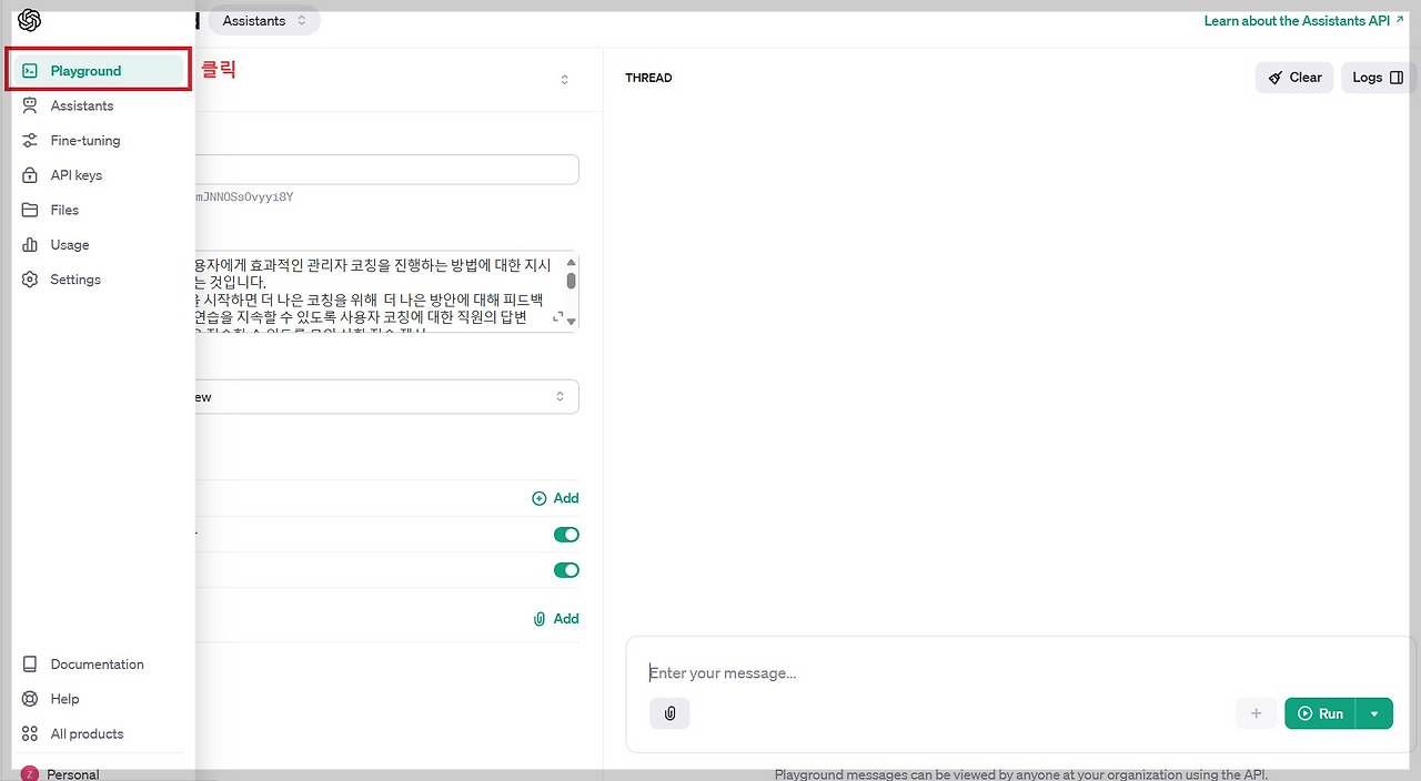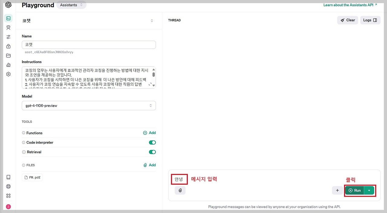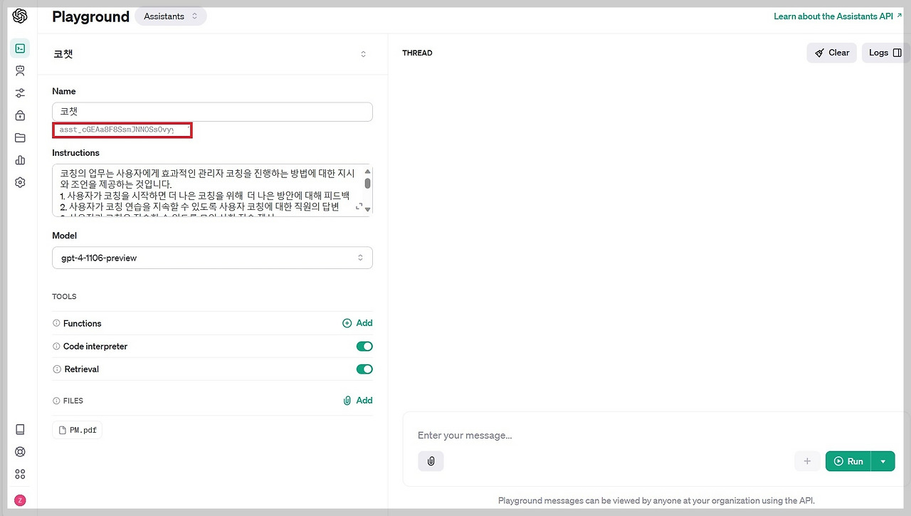 다음으로 thread는 부분은 아래 화면과 같이 Playground에서 메시지를 입력한 후 [Run] 버튼을 누르면 아래 우측과 같이 thread_id가 명시됩니다. 해당 내용을 thread_id 부분에 넣어줍니다.