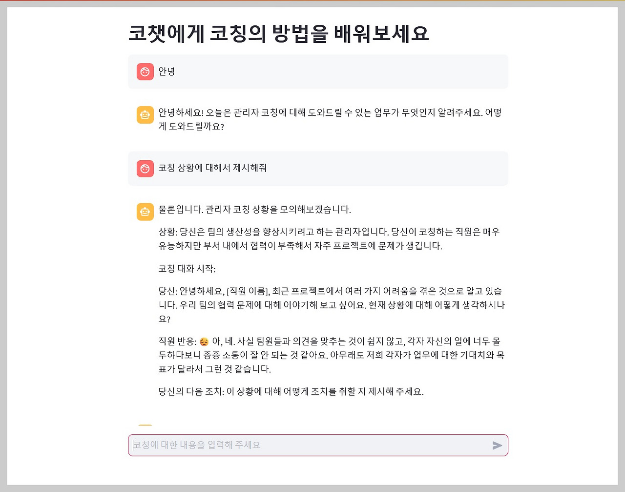'코챗' 챗봇은 이 지침서를 바탕으로 만들어졌으며, 가상의 코칭 상황에서 연습할 수 있도록 도와줍니다.