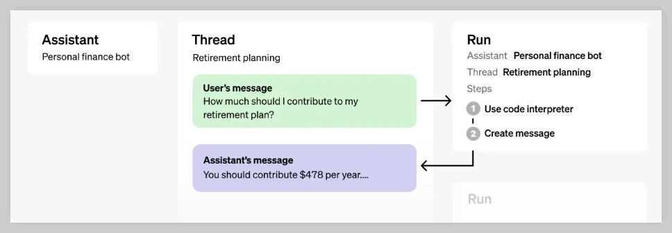 도구(Tools): OpenAI가 제공하며 호스팅하는 코드 해석(Code Interpreter) 및 검색 도구(Retrieval)를 API가 지원합니다.