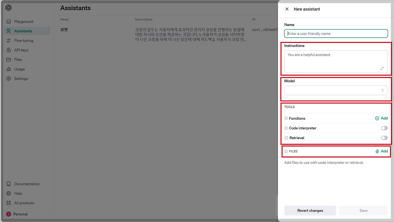 지침(Instuctions): Assistants API 모델이 수행해야 할 행동과 반응 방식에 대한 가이드라인입니다.