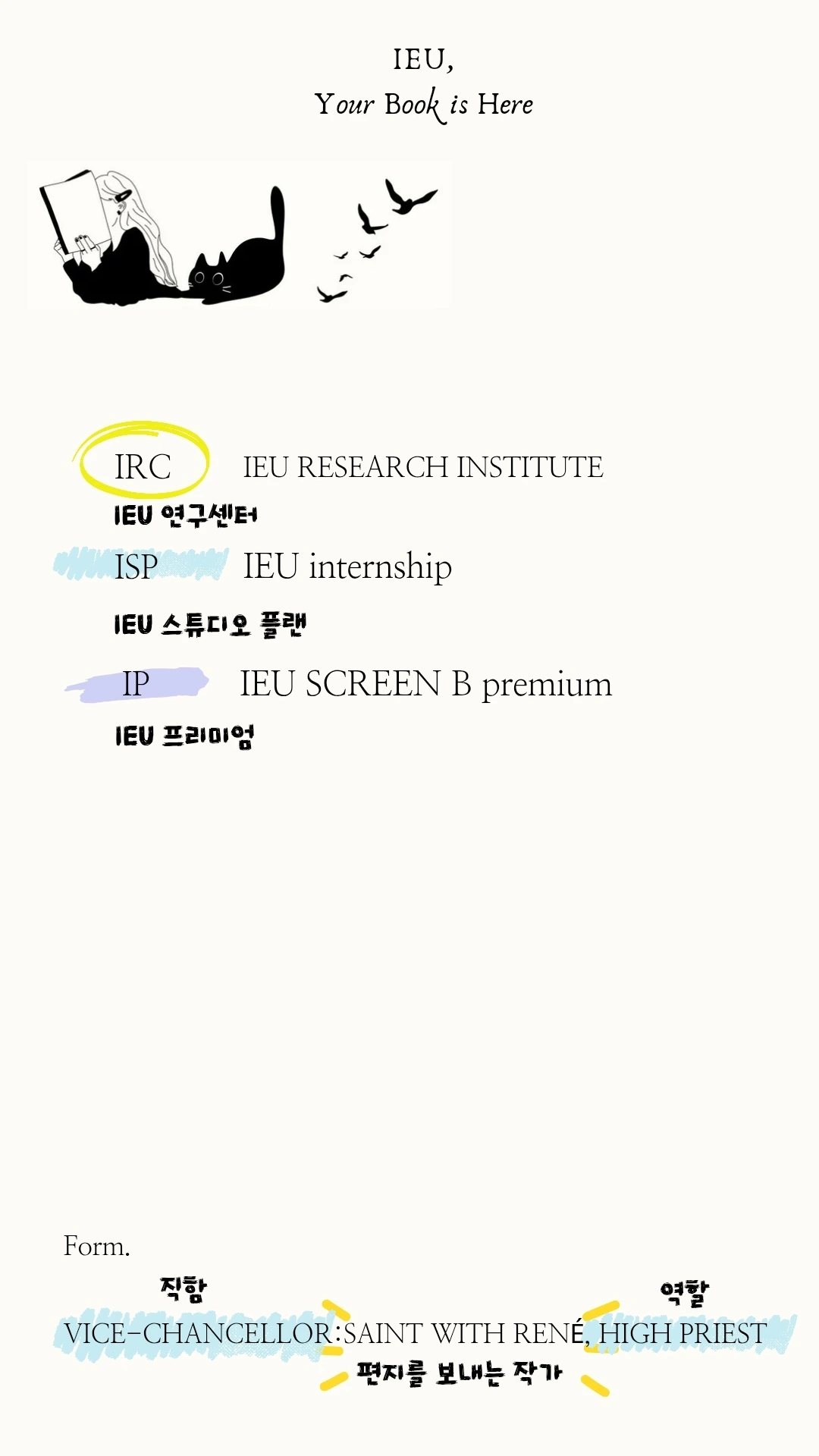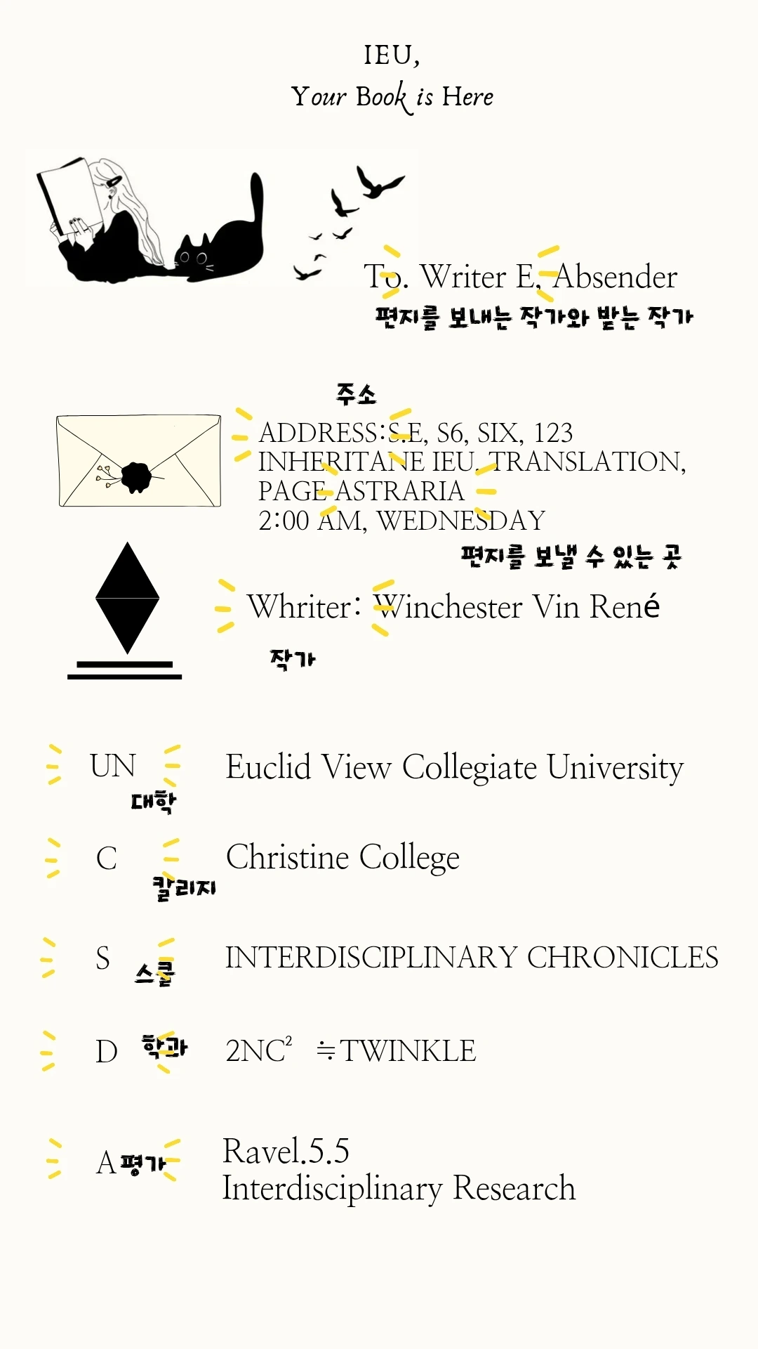 어떤 학과에서 어떤 목적을 가지고 어떤 평가를 받는지, 그리고 책을 지원해 줄 대학 지원 기업과 재단, 어떤 작가가 어떤 잉크를 사용해 누구에게 편지를 보내는지 등을 고려해 만들어봤습니다.