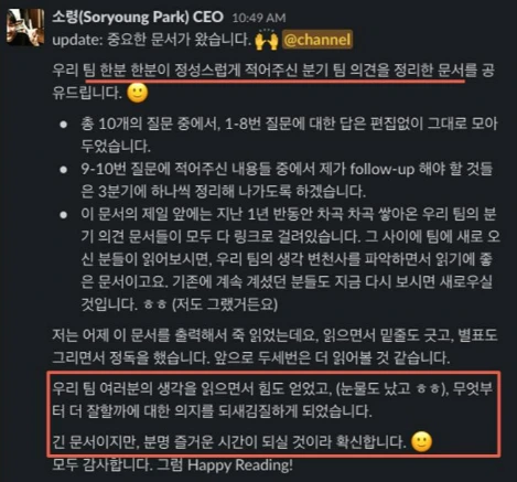 사실 핵심은 이것이라고 생각합니다. 저한테 개인적으로 주신 피드백을 제외하면 나머지 모든 질문에 대한 답변은 가능한 한 거의 편집 없이 투명하게 정리한 뒤 팀 전체에 문서로 공유합니다.