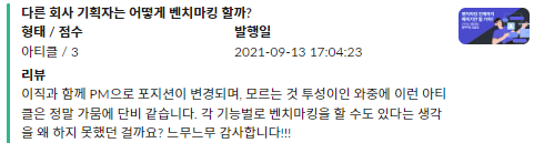 다음은 <다른 회사 기획자는 어떻게 벤치마킹 할까?> 아티클을 읽고 남겨주신 고객님의 후기입니다. 고객님의 직무 변경에 실질적인 도움이 되었다니 너무나 뿌듯한 후기였어요!