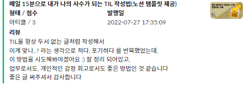마지막은 <매일 15분으로 내가 나의 사수가 되는 TIL 작성법> 아티클을 읽고 남겨주신 고객님의 후기입니다. 멤버십 팀이 제공하는 노션 템플릿이 독자분들께 도움이 되고 있다는 것을 알게 되어서 동기부여가 많이 되는 리뷰였어요! 앞으로도 업무에 도움 되는 다양한 템플릿으로 찾아뵐 수 있도록 노력할게요.