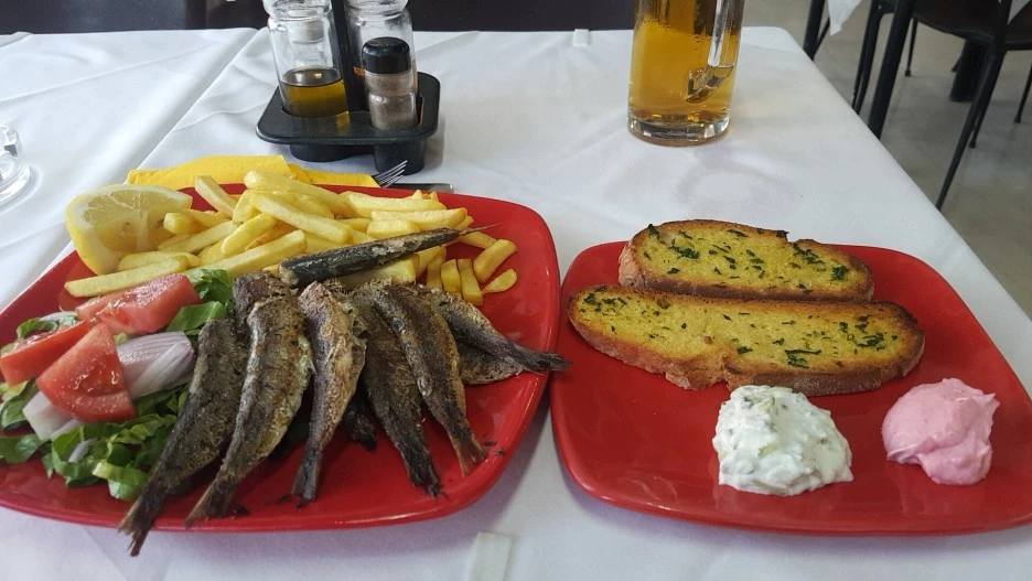 보라색 양파와 토마토가 아삭 거리는 그릭 샐러드와 바삭거리는 감자튀김은 한 잔의 맥주와 정말 찰떡궁합입니다. 맥주를 한 잔만 마셔도 온몸이 토마토처럼 붉어지는데 푸르고 잔잔한 바다를 바라보면서 저녁을 먹으니 맥주를 안 마실 수가 없습니다. 차가운 맥주를 한 잔 들이켜고 이번에는 정어리를 하나 집어먹습니다. 숯불에 구워 아직 따듯한 정어리는 뼈째 씹어 먹어도 부드럽습니다. 마치 열빙어를 먹는 듯 머리부터 꼬리까지 씹어 먹었습니다. 푸른 바다의 향기가 입안에 퍼집니다. 제대로 된 밥은 오늘 처음 먹었기 때문에 이 모든 접시를 바닥까지 긁어먹었습니다. 역시 푸른 바다에서 자란 신선한 생선인 탓인지 질리지 않습니다.