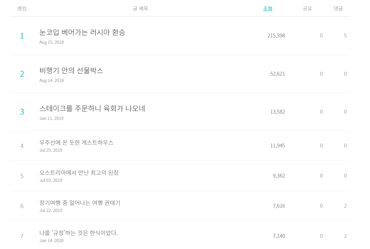 노출된 글들의 공통적인 특징은 클릭해 보고 싶은 제목이라는 점이다. “스테이크를 주문하니 육회가 나오네” 라든지, “에스토니아 전통 시장, 김치라면?” 이라든지, “장기여행 중 나타나는 여행 권태기”와 같이 호기심을 불러오는 제목들이었다. 이런 제목들이 노출에 유리하다는 것을 알게 되니 그때부터 제목 짓기가 글의 가장 중요한 부분이 되었다. 유튜브와 마찬가지다. 눌러보고 싶도록 자극적인 제목을 짓는 유튜브들이 더욱 조회수가 높은 것처럼, 내용을 모르고 제목만 나열된 시장에서 선택을 받기 위해서는 겉표지인 제목이 가장 중요한 것이다. 이 사실을 알고 난 이후부터 제목 짓기가 내 글쓰기 중 가장 중요한 부분이 되었다.