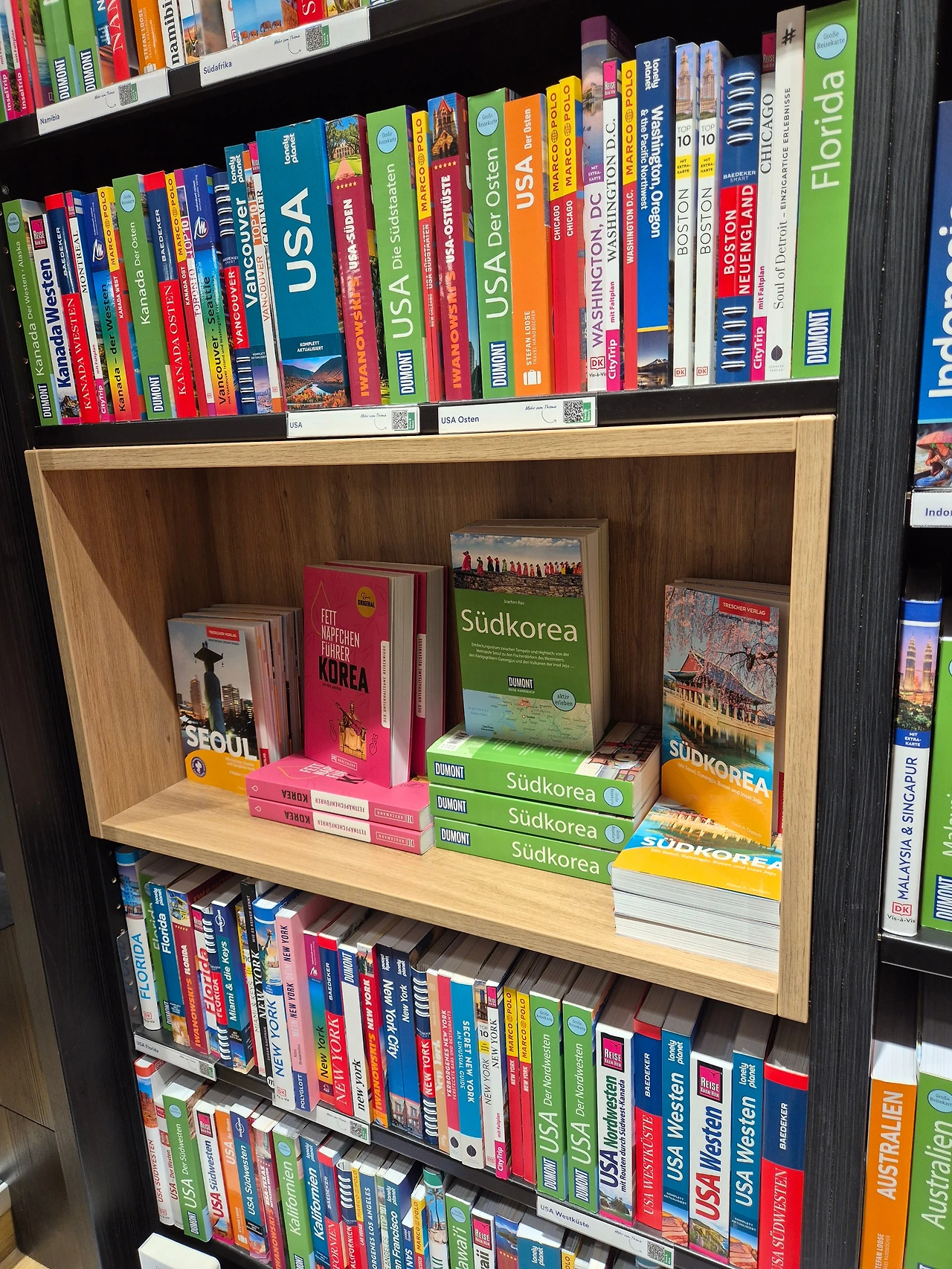 하지만 뭔가 달라졌다. 코로나 이후 독일에서 살아가면서, 점차 한국에 대한 국가 브랜드가 견고해지고 있다. 맵지만 건강한 음식, 가장 핫한 문화 트렌드의 국가라는 이미지가 생기고 있다. 한 국가에 대한 이미지는 살아가면서 크게 체감하기는 어렵다. 하지만 브레멘의 한 대형 서점에 들어간 오늘 드디어 독일에서 한국에 대한 이미지가 어떤 이미지인지 확실하게 체감하였다. 케데헌을 포함해 한국과 관련된 서적이 에스컬레이터 바로 앞에 한 코너를 자리 잡았다. 음식 관련 서가에도 오징어 게임뿐만 아니라 정관 스님에 대한 책이나 한국 음식에 대한 책이 떡하니 자리 잡고 있다. 게다가 여행 코너를 가더라도 대놓고 서가 한 칸을 한국 여행 가이드북들로 채워두었다. 다른 나라는 모르겠지만, 그동안 전쟁, 김정은이라는 부정적 국가 이미지가 독일에서만큼은 최신 트렌드세터 국가라는 이미지로 바뀐 듯하다.