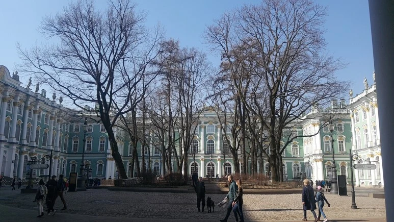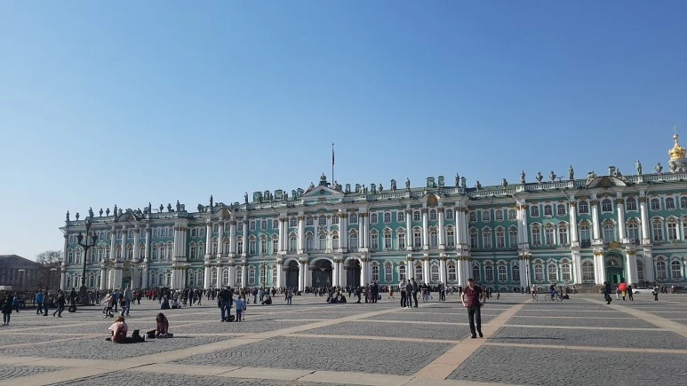 이제 겨울궁전을 가까이서 볼 시간입니다. 겨울궁전, 혹은 에르미타주는 총 다섯 채의 이어진 건물 중 로마노프 왕조에서 본관으로 이용한 가장 아름다운 건물을 말합니다.