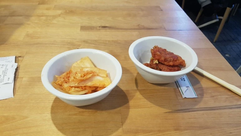 반찬부터 골라 먹어보니 김치전은 일품입니다. 한국에서도 기사식당을 가면 가끔 나오는 김치전 맛입니다. 바삭하게 잘 만들었습니다. 김치는 아쉽게도 폴란드인 입맛에 맞추기 위해 매운 맛을 줄이니 신 맛이 강합니다. 라면이 있다면 함께 먹고 싶은 군침도는 신 맛입니다.