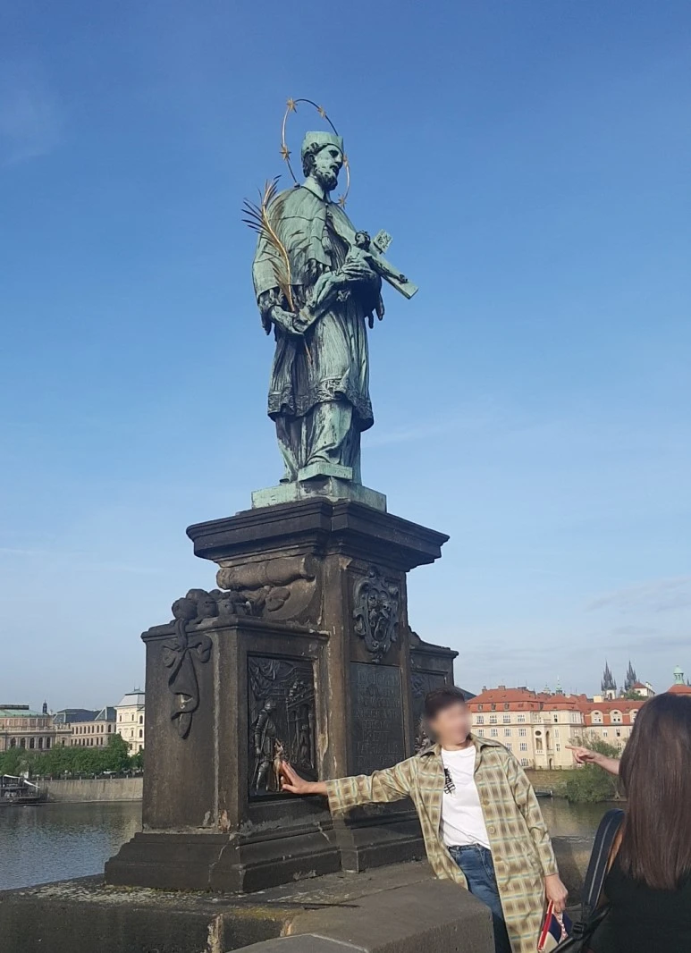 서른 개의 성인들의 동상이 다리 양 옆으로 나란히 전시되어 있는 카를교에는 모든 동상들이 사연을 가지고 있습니다. 그중 가장 사람들에게 사랑받는 동상은 얀 네포무츠키 신부의 동상입니다. 대주교에 대립하던 보헤미아의 왕에 의해 이 장소에서 처형당하고 후에 다리 위의 유일한 청동 동상으로 만들어진 얀 네포무츠키 신부의 동상은 소원을 잘 들어주는 용한 동상이라는 소문이 있습니다. 수많은 사람들이 줄을 서서 소원을 빌기 위해 기다리는데 얼마나 많은 사람들이 소원을 빌어왔는지 동상 아래 동판이 맨질맨질합니다.