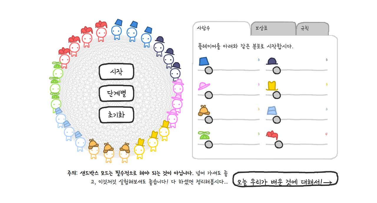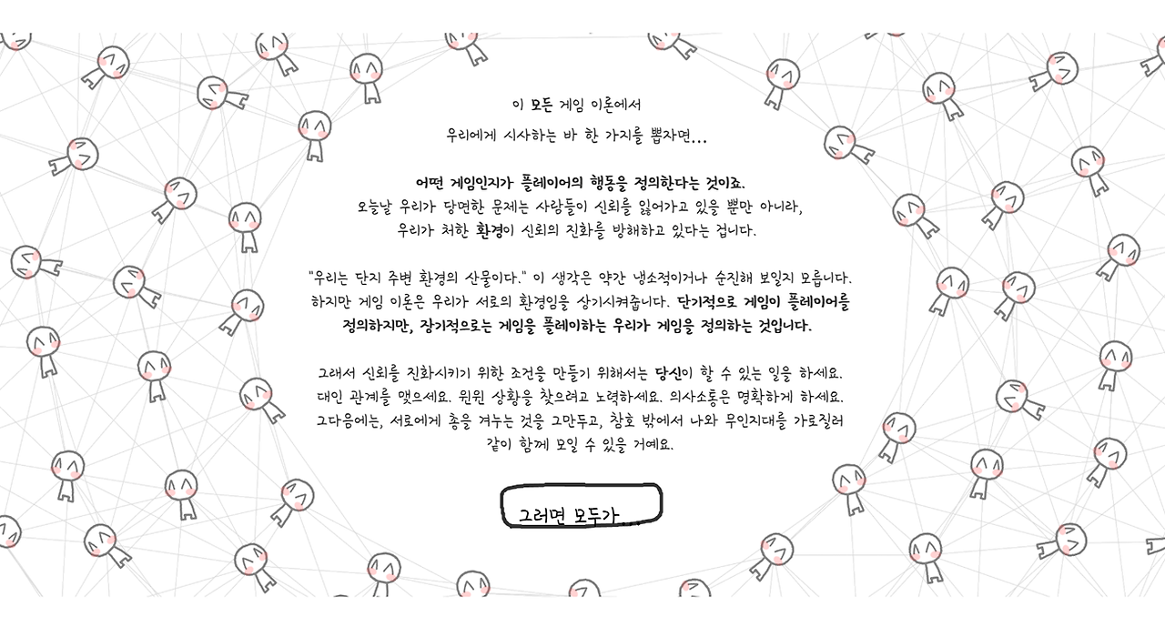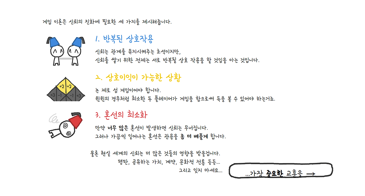 현실에서는 단순한 성향 외에도 상황이나 분위기, 종교, 관계, 계약 등 여러 가지 외부 요인의 영향을 많이 받겠지만 신뢰가 형성되기 위해선 반복된 상호 작용이 있어야 되고, 서로 간의 이익이 분명히 존재해야 하는 Non제로섬 게임이어야 하며, 너무 많은 혼선이 발생하면 안 된다는 교훈을 주고 있습니다. 여러분은 어떤 성향의 사람이신가요? 게임을 통해 신뢰가 어떻게 형성되고 발전하는지 살펴보세요.