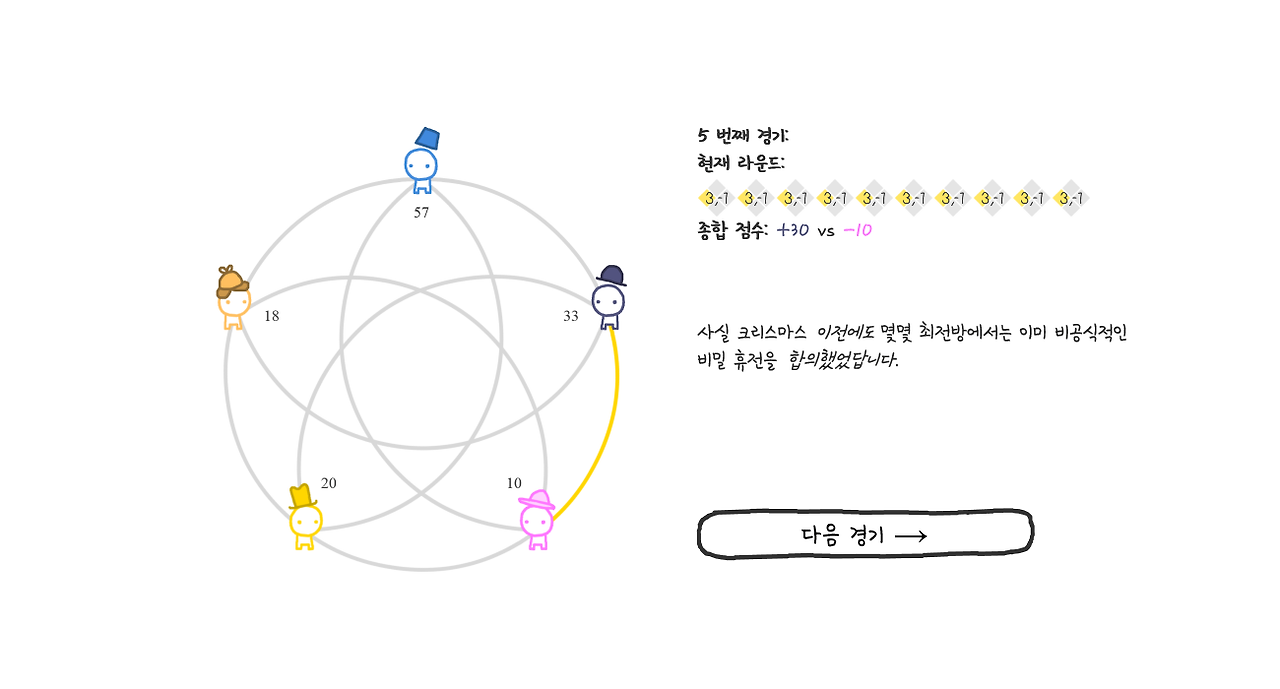 이 게임이 정답이 될 순 없겠지만 `확률`적으로 어떤 사람이 되면 가장 높은 확률로 살아남을 수 있는지, 그리고 어떤 사람이 가장 큰 이익을 남길 수 있는지 보여주는 게임입니다. 단순한 숫자일 수도 있지만 그래도 신뢰라는 건 어디에서 어떻게 형성이 되는지 보여주는 하나의 지표가 될 수 있습니다.