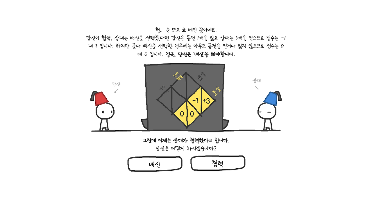 게임은 간단하게 진행이 됩니다. 어떤 성향의 사람인지 모르는 상대가 나오고 내 기준에서 상대와 협력할지, 배신을 할지 정하며 많은 동전을 모으는 게임입니다. 내 태도에 따라 상대의 태도가 변할 수도 있고, 내 태도와 상관없이 한결같은 태도를 보일 수도 있고 어떤 사람인지 모르는 상황에서 협력과 배신을 이어가게 됩니다.