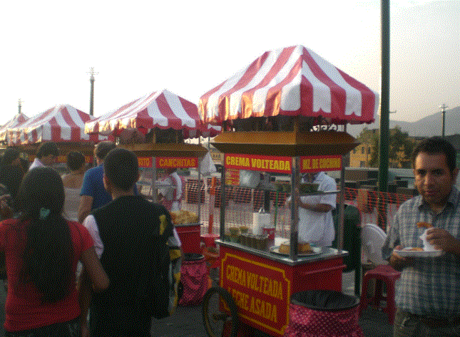 돌아다니다 보니 배가 고프다. 맛있는 음식이 잔뜩 있는 곳이 있다고 해서 다시 버스를 타고 이동을 하니 길거에 푸드 카트들이 잔뜩 늘어서 있다. 달달한 냄새에 이끌려 제일 먼저 우리는 페루의 대표적인 음식인 우유와 밥을 섞어 만든 아로쓰 꼰 레체를 먹었다. 그리고 안띠꾸초(소 심장으로 만든 구이), 치플레(바나나 튀김), 삐까로네 도넛까지 먹고 나니 배가 든든하다.
