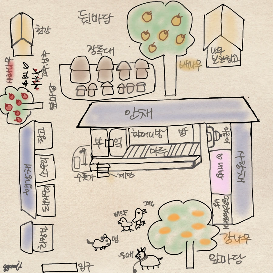할머니가 행랑채라 불렀던 곳은 곡식과 채소 등 먹거리가 있는 작은 창고와 소우리, 돼지우리, 그리고 끝쪽으로 화장실이 있었다.