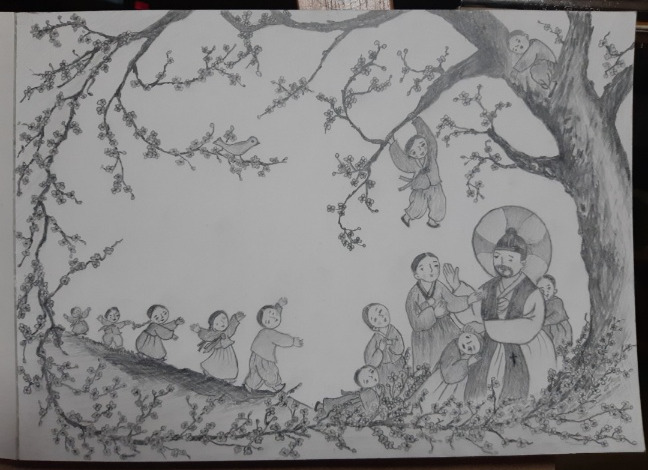 어머니 장례를 치르고 우울해하던 중에 코로나가 시작되었고, 외출이 어려우니 마음의 병은 더 깊어졌다고 한다. 성당에서 우연히 가져온 그림을 보고 집에 있던 연필로 연습장에 그려본 것이 시작이라고 한다. 그려보니 생각보다 재미있고 잘 그려져 계속 그리게 되었다는데 그 순간은 아무 생각이 안 들어서 좋았단다.