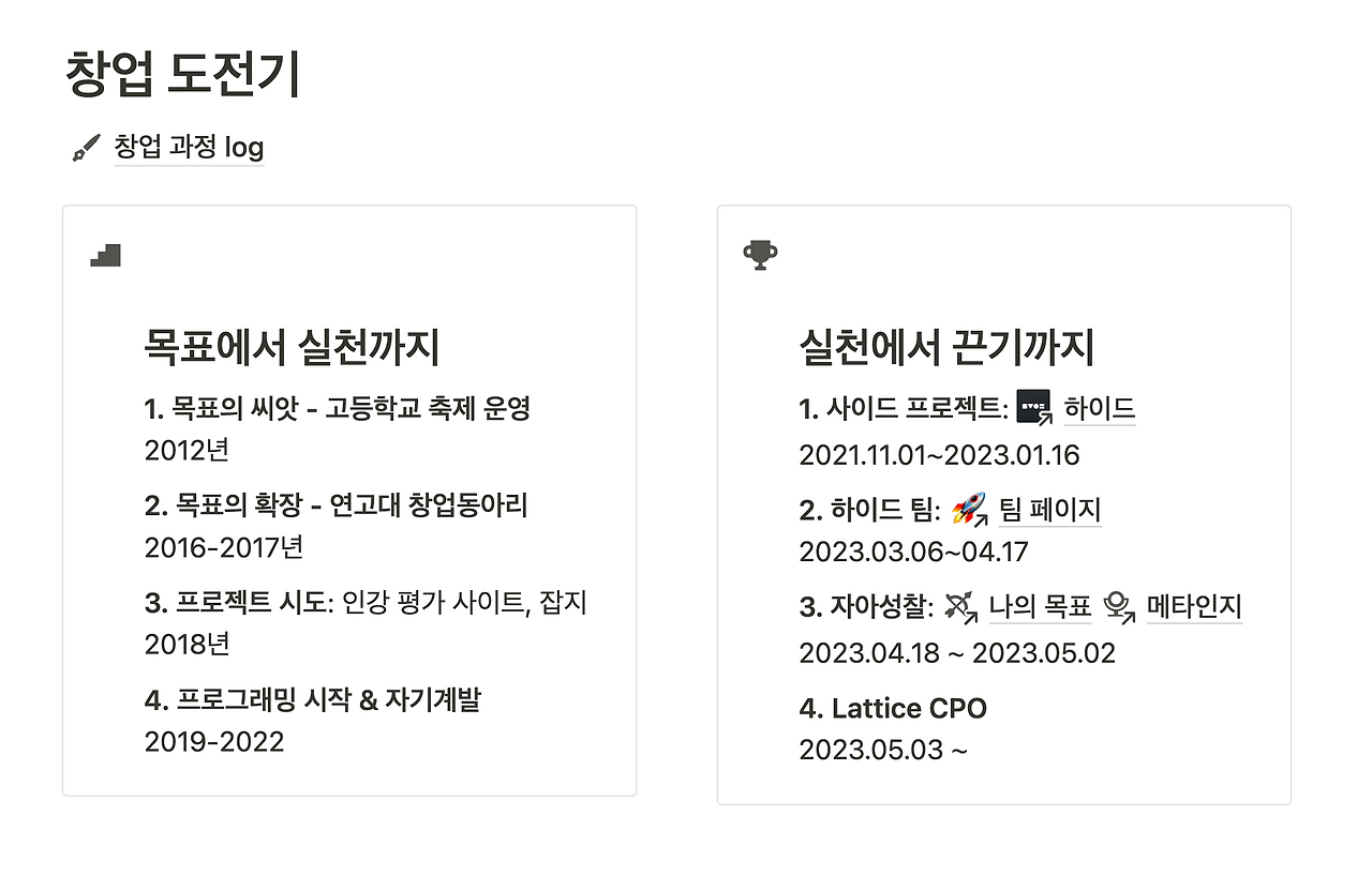 그렇게 저는 2023년 1월에 두 번째 단계에 돌입했습니다. 안정적인 삶과 탄탄한 성장의 길을 뒤로하고, 창업을 위해 퇴사를 한 것입니다. 저는 퇴사할 당시만 하더라도 스스로를 유망주라고 생각했습니다. 그러나 예비창업가의 세계에도 연습생의 세계처럼 정말 뛰어난 인재들이 많이 존재했고, 성취는 생각보다 가깝지 않았습니다. 하지만 지금의 저는 '어렵다고 금세 포기하면 3단계에 들어서지 못한다'는 것을 알고 있으며, 앞으로 제 최상위 목표인 '창업'을 성취하기 위해 끈기 있게 나아갈 예정입니다.