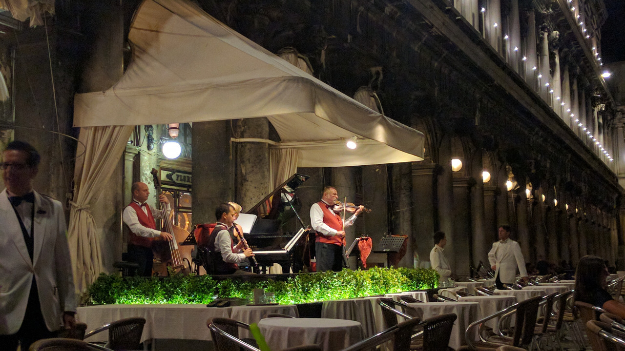 베네치아 산 마르코 광장의 밤은 노랗게 반짝거리는 가로등 불빛과 함께 아름다운 선율로 가득 차 있었다. 웬만한 카페며 레스토랑 앞에서 전속 악단들이 연주를 하고 있어서였다. 음악 소리에 귀를 기울이며 광장을 걷다가 유럽에서 가장 오래된 카페라는 '카페 플로리안' 앞에 자리를 잡았다. 이곳은 유명세에 비해 손님이 별로 없어서 한산했다. 반대편 카페에서는 최신 팝이나 귀에 익숙한 유명한 영화 음악 위주 레퍼토리로 연주를 하는데, 여기서는 꿋꿋이 전통의 클래식 음악들만 들려주고 있어서 그런지 저쪽보다 테이블이 많이 비어 있는 듯했다. 전통과 역사가 좋은 벌이로까지 절로 이어지진 않는 모양이다.