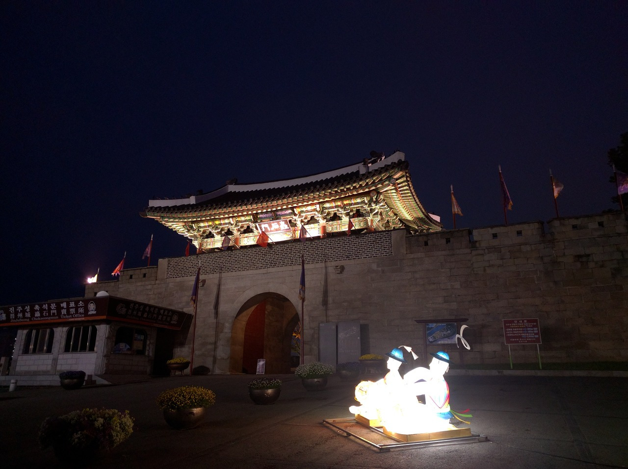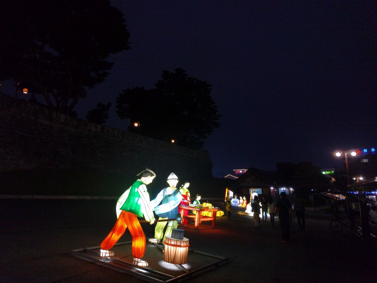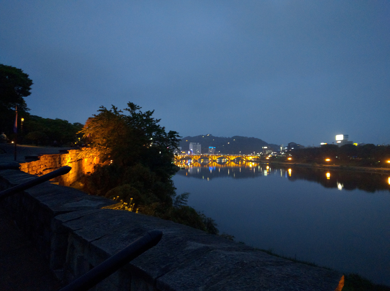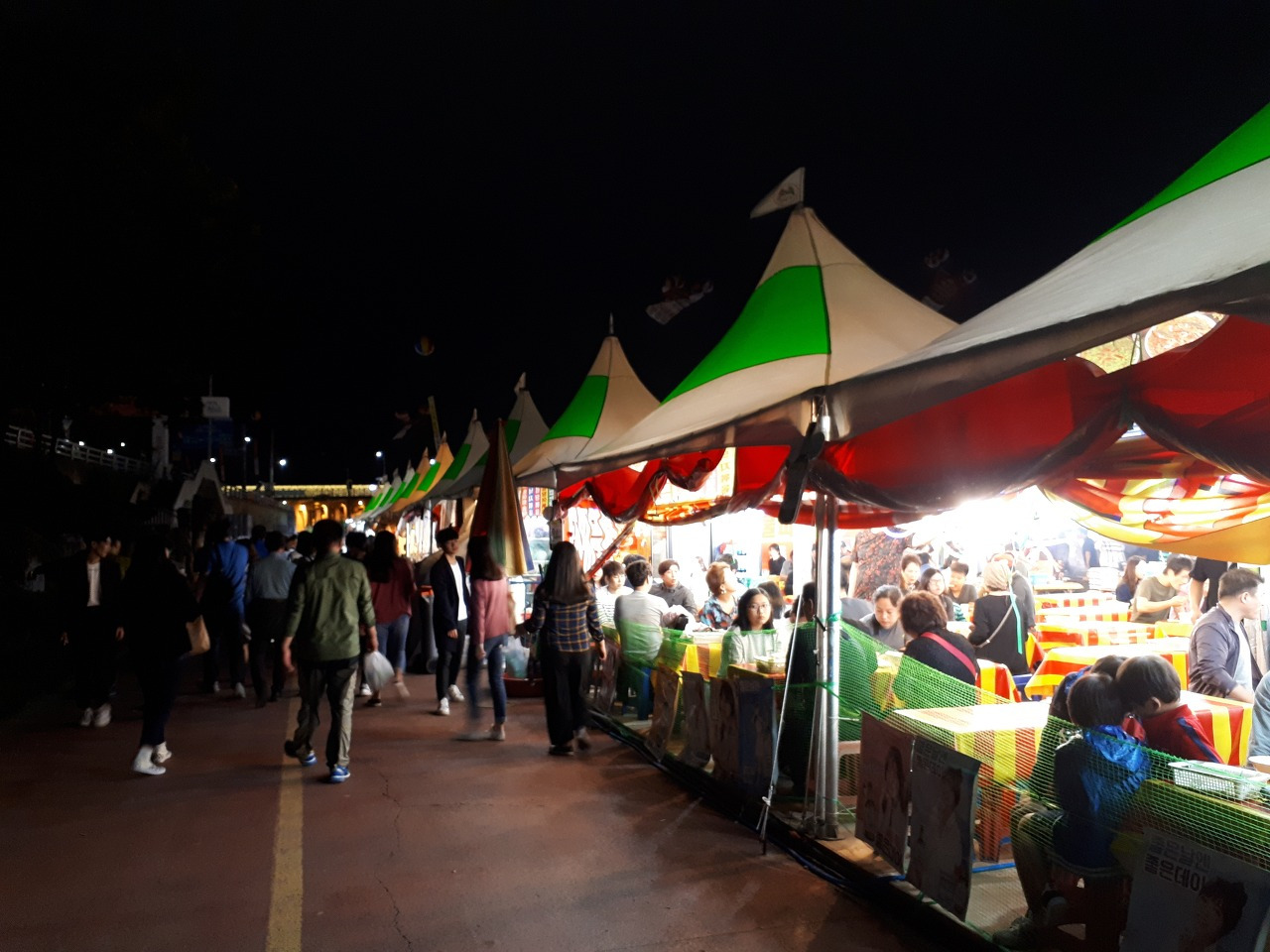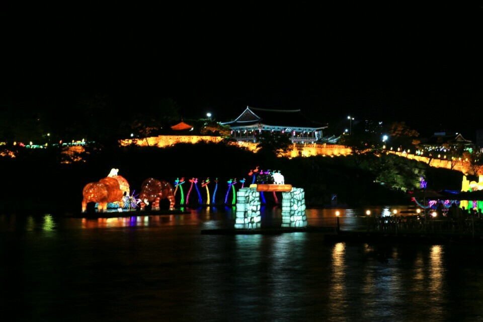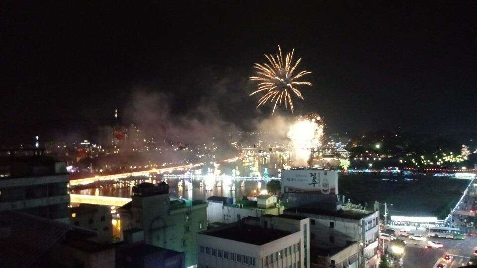 시작은 냉면집에서부터였다. 만화책 <식객>에 소개될 만큼 제법 유명한 진주냉면집에 들렀다. 진주냉면의 특징은 해산물 육수, 그리고 고명으로 얹혀 나오는 육전이다. 아내는 신기해하며 냉면을 먹었다. 저녁을 배불리 먹은 다음에는 오랜만에 진주 시내버스를 타고 가다 구 법원 정류장에서 내렸다. 여기서 남강변을 따라서 주욱 걸어가면 서울의 예술의 전당과 비슷한 역할을 하는 문화예술회관, 그리고 축제가 벌어진 야시장과 진주성을 지나가며 거리의 유등 구경을 할 수 있다. 추석 즈음해서 열리는 '개천예술제' 행사 덕분에 내걸린 유등들이다. 개천예술제란, 10월 개천절 즈음해서 진주에서 열리는 종합문화예술축제이다. 1949년부터 제1회 영남예술제라는 이름으로 열리기 시작해서 2019년까지 (한국전쟁 때 몇 회를 건너뛰는 바람에) 69회째를 맞이하고 있는 유서 깊은 행사. 몇 주 간의 축제 기간 동안 남강을 비롯해서 주요 건물과 거리마다 고운 색깔의 유등들이 도시의 밤을 환히 밝힌다.