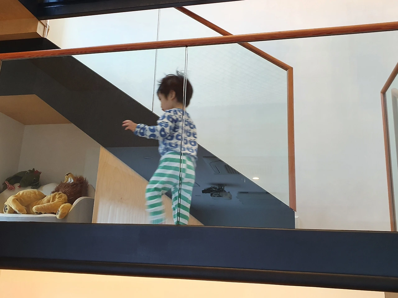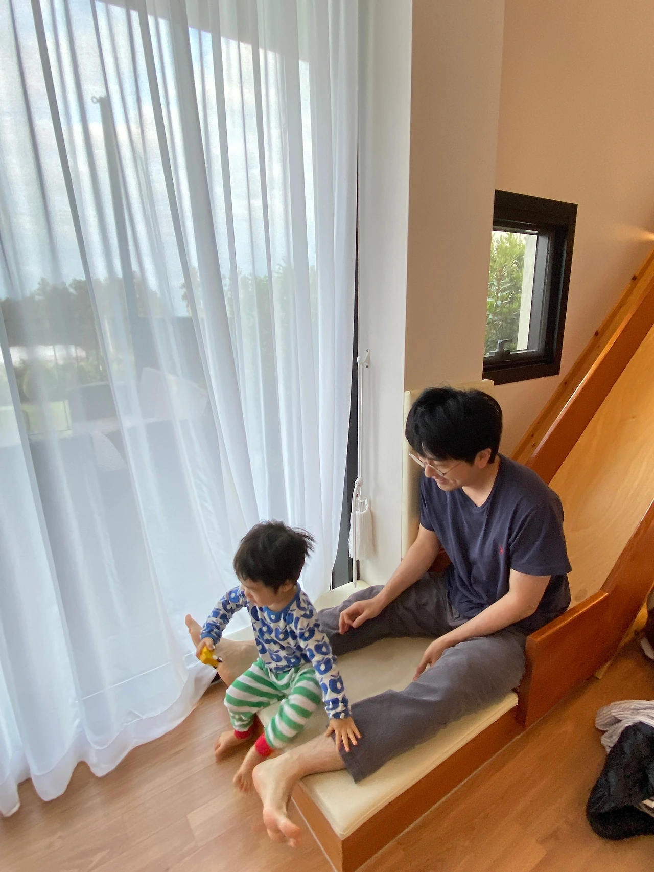 창밖으로 먼동이 희붐하게 밝아왔다. 2박 3일의 여행 동안 아침잠이라는 걸 잃어버린 아이는 어느새 눈을 떴다. 일어나자마자 졸린 눈을 비비지도 않고 침대 밖으로 튀어 나갔다. 이내 아빠 손을 붙잡고 이끌더니 계단을 바삐 내려갔다. 하루를 시작하자마자 발걸음을 달려 이른 곳은 1층 놀이터. 여기에 있는 자동차 장난감들을 너무나도 보고 싶었나 보다. 밤새 자동차 생각에 몸이 달았는가. 넋을 잃은 표정으로 한참이나 갖고 논다. 그러다가 어느 순간부터 1.5층으로 이어진 미끄럼틀에 관심을 보이는 아이. 혼자서 타기엔 경사가 다소 심하다. 또다시 내 손을 붙잡고 이끌어 계단을 올라갔다. 내 품에 포옥 안긴 채 주욱, 하고 미끄럼을 탔다. 타고나니 까르르, 웃으면서 “또!”를 외치며 내 옷소매를 잡아끈다. 그게 시작이었다.