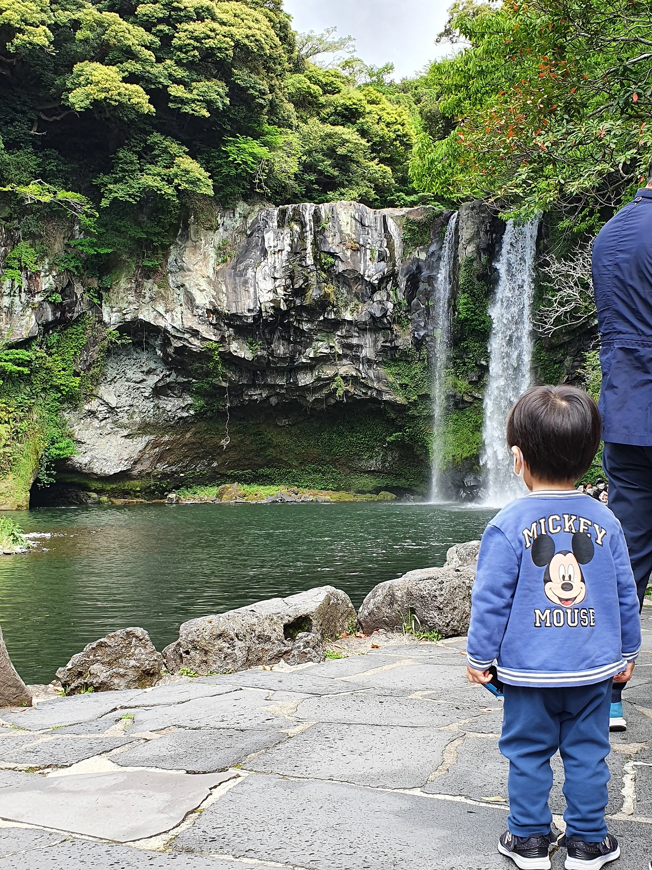 숲이 우거진 완만한 길을 걷다 보니 어느덧 폭포 앞에 도착했다. 아래로 부드럽게 쏟아지는 물줄기는 시원한 소리를 내뿜었다. 수면에 부딪쳐 튀어 오른 작은 물방울들은 햇빛과 뒤엉켜 하얗게 반짝거렸다. 이과수니 빅토리아니 하는 외국의 폭포처럼 웅장하지는 않다. 유럽이나 일본의 정원에서 볼 수 있는 세밀한 아름다움도 없다. 하지만 지금 이곳에 꼭 있어야만, 그동안 있어왔던 존재처럼 자리 잡고 있는, 과하지도 모자라지도 않는 모습의 천지연이었다. 그 자태를 바라보고 있으니 마음이 편안해졌다. 아이는 인생 처음으로 마주하는 폭포가 신기한지 "우아-!" 하고 소리 질렀다. 물, 물, 거리면서 폭포를 가리키며 신나했다. 수영장 들어가는 건 무서워하면서 물 구경은 되게 좋아한다.