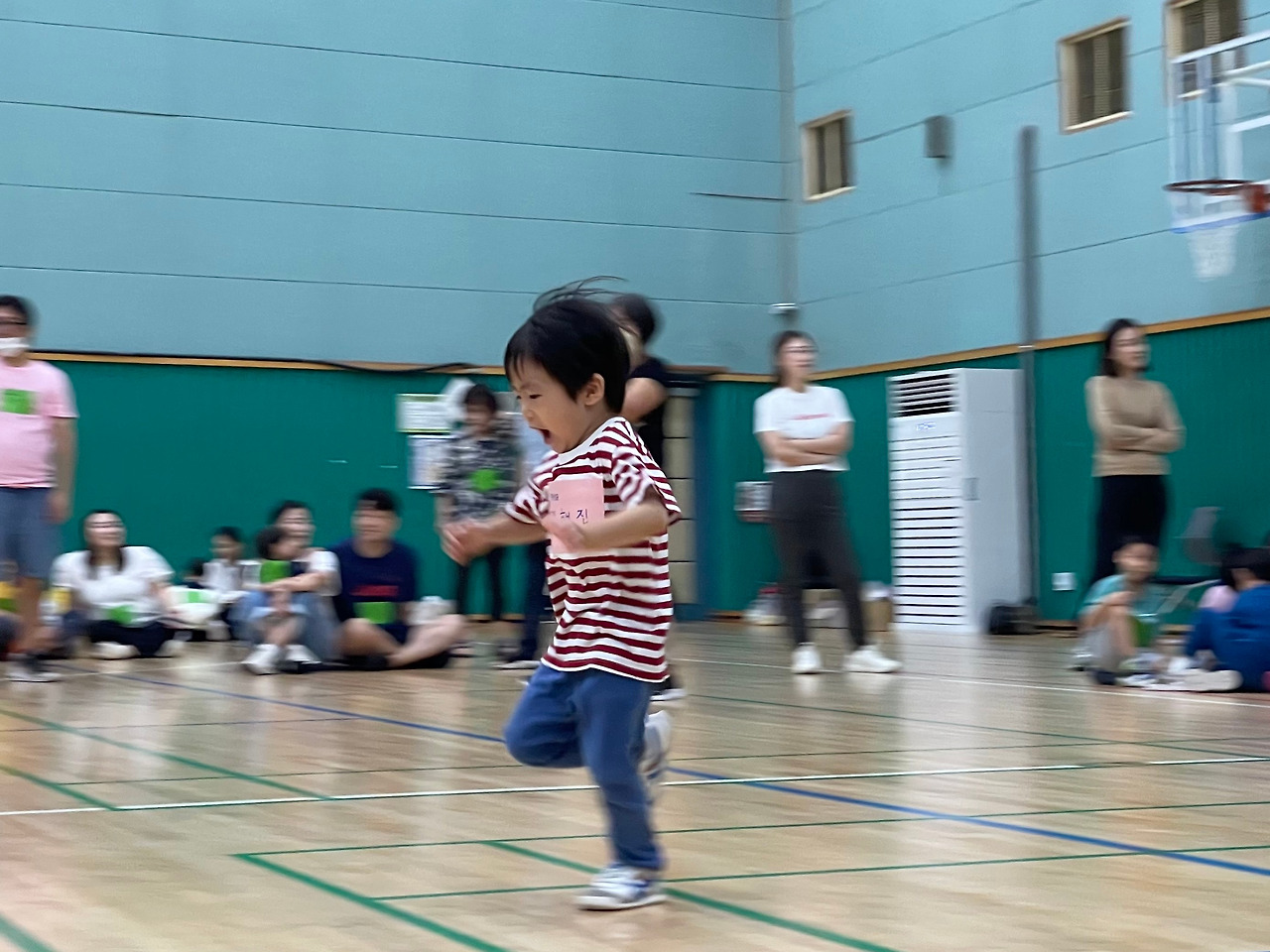 이내 도착한 체육관. 운동회가 열리는 3층 대강당 문을 열었다. 안에 갇혀있던 시끌벅적한 소리가 튀어나와 귀를 따갑게 했다. 이미 아이들과 학부모들로 가득 차 있던 곳. 수많은 아이들 중 가만히 서 있거나 천천히 걷는 아이는 아무도 없었다. 모두가 각양각색의 소리를 지르면서 우당탕탕 뛰어다니고 있었다. 왜 이 나이대 아이들은 아무도 걷지를 않을까. 동작의 '기본값'이 달리기로 설정되어 있는 것 같다. 소란스러운 아이들을 정돈해서 배정된 편에 따라 줄을 세우고, 가슴팍에 이름표 스티커를 붙여주고, 제 맘대로 뛰쳐나가려는 아이 손을 붙들고. 아직 운동회는 시작도 안 했건만 아이의 엄마 아빠들과 어린이집 선생님들은 고생 중이었다. 그러고 보니 어린이집 선생님들은 주말인데 쉬지도 못하고 고생하시는구나. 문득 같은 직장인으로서 안쓰러운 동료애 같은 감정이 일어났다.