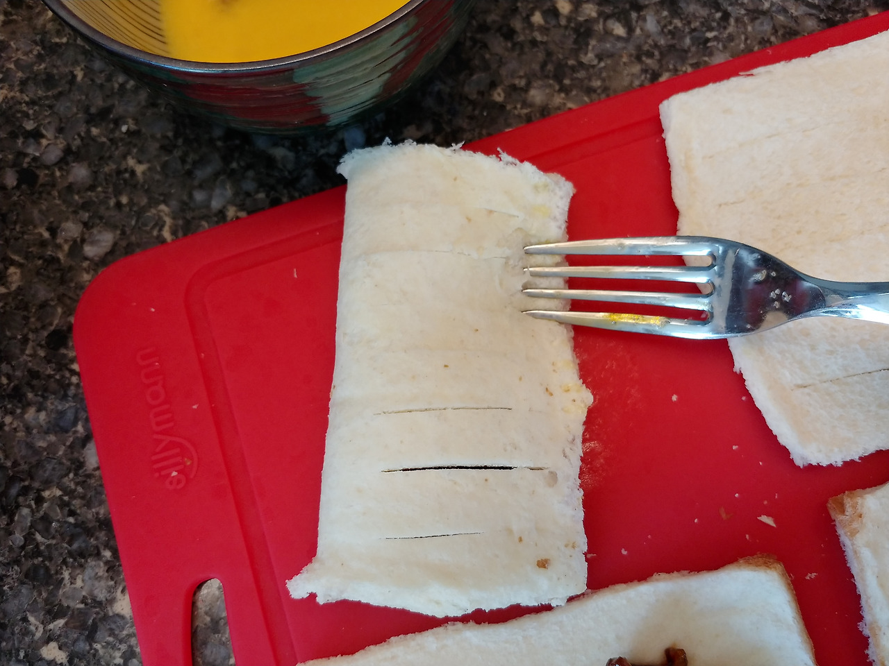 파이 반죽을 직접 하지 않아도 돼서 참으로 다행이다. 이걸 어느 세월에 밀가루 반죽하고 앉아있나. 남은 식빵 조각을 반죽 대용으로 사용한다. 테두리를 잘라 둔 식빵을 얇게 펴면 된다. 밀대로 잘 눌러서 말이다.
