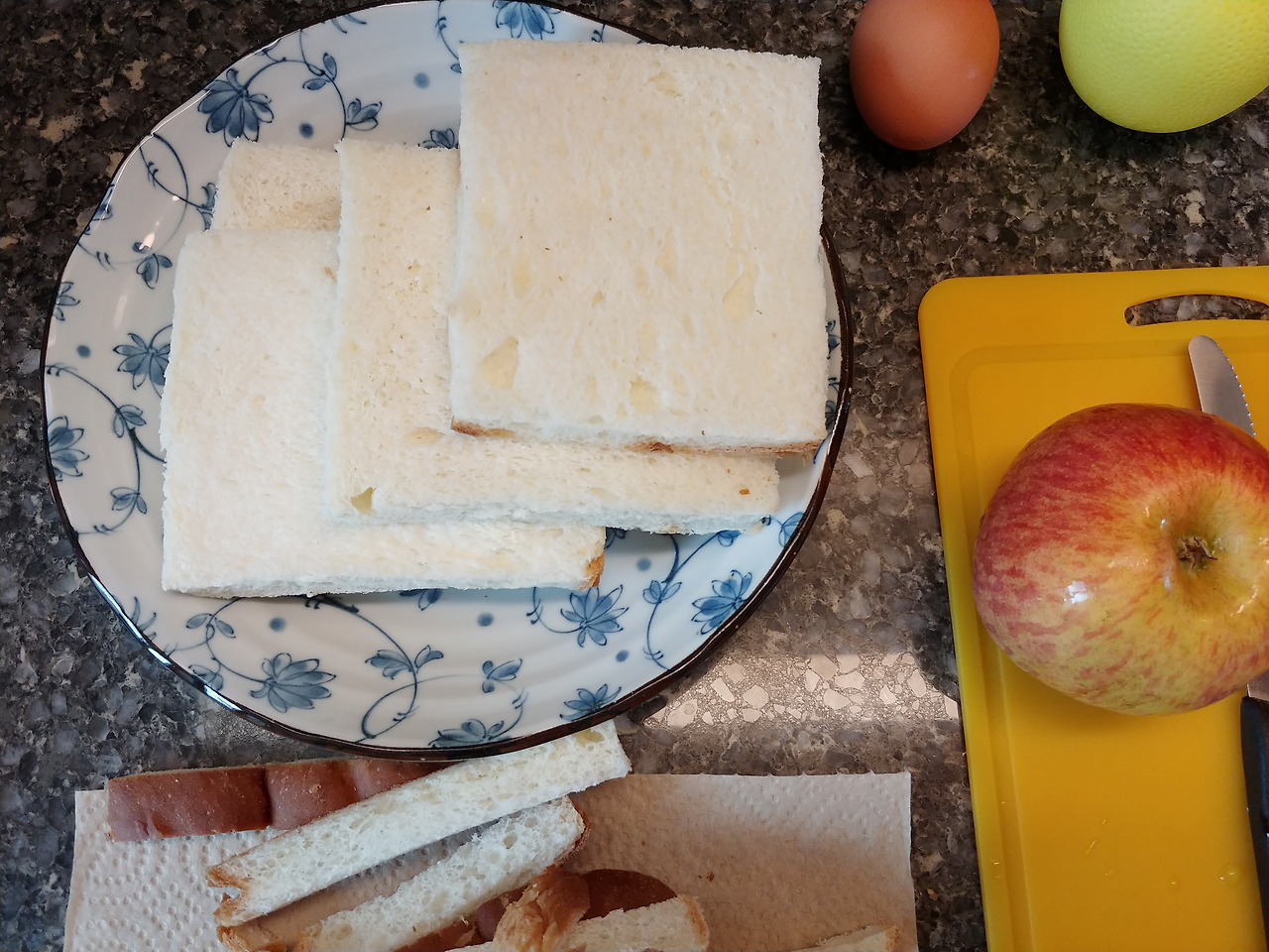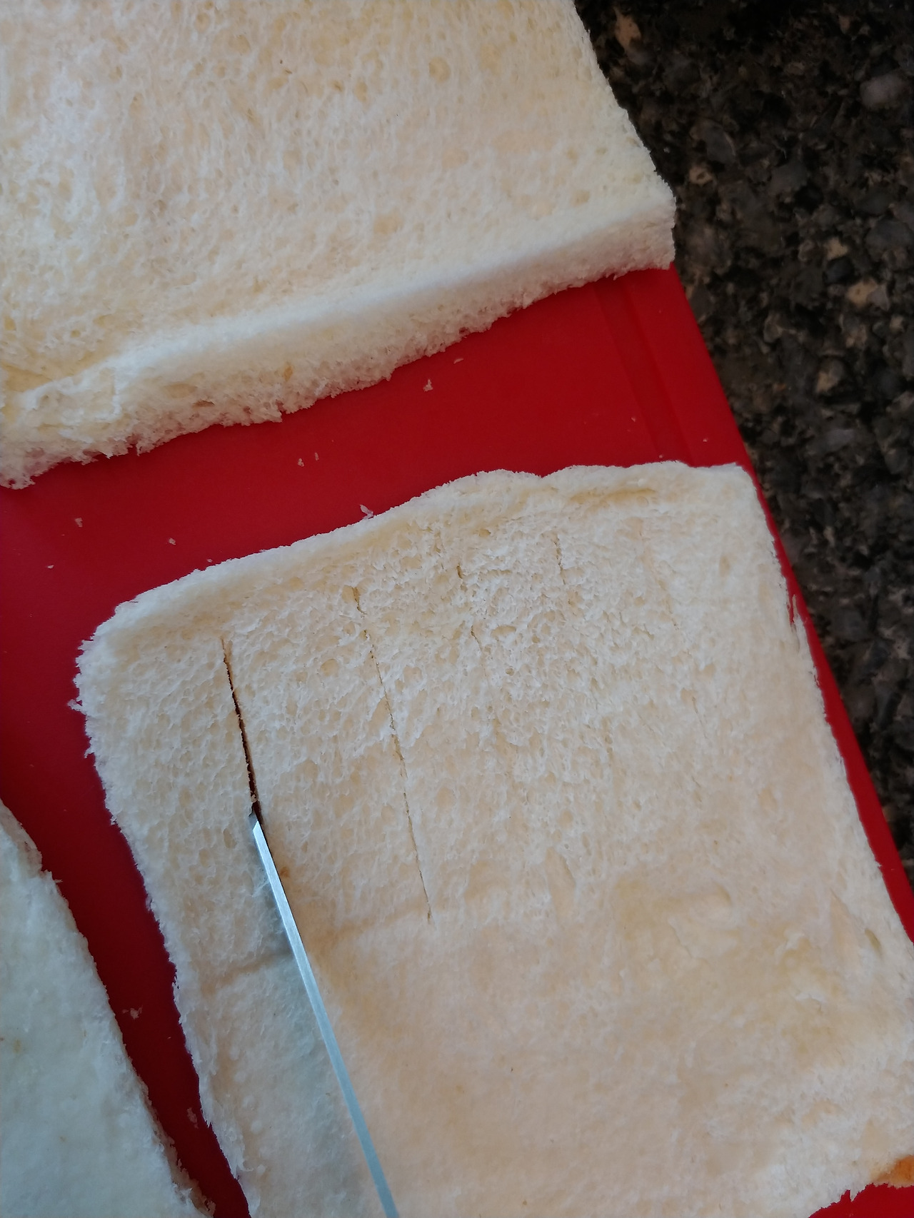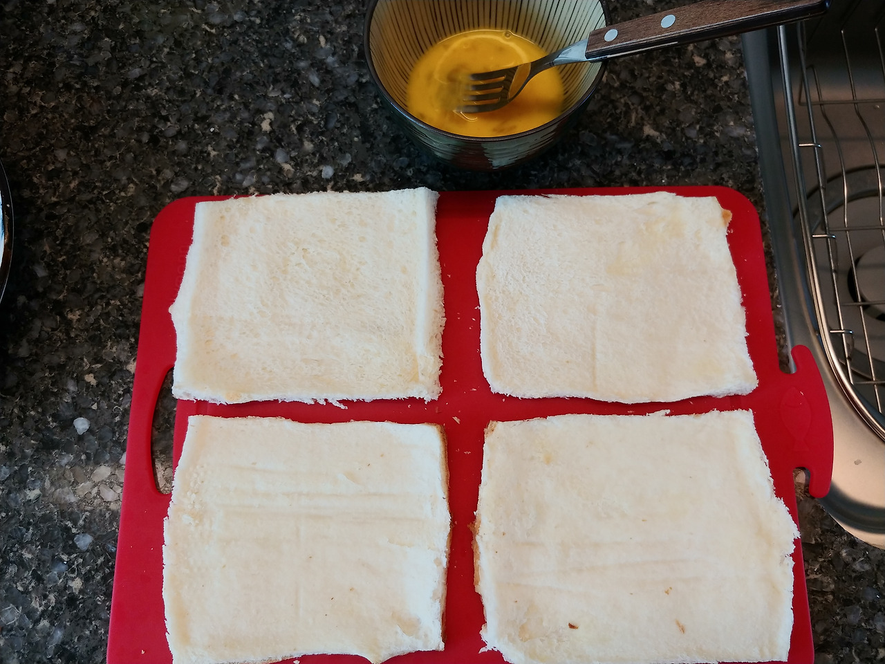 부르주아는 식빵 테두리를 먹지 않는 법이다. 가위로 사각사각 겉 테두리를 잘라냈다. 오늘은 가위뿐만 아니라 포크와 칼 등등 외과적 도구들을 많이 사용하게 될 거다. 하얀거탑 장준혁이 된 기분으로 요리를 해 보자.