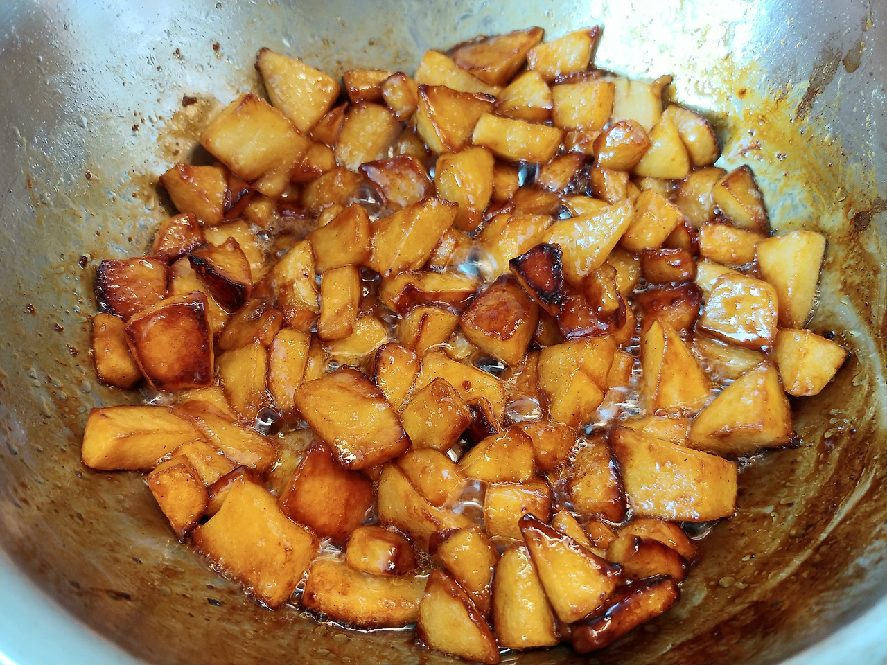 고구마 맛탕 아님. 사진이 왜 이따구로 나왔지. 설탕에 푹 졸여진 달달한 사과 조각들이다. 불을 끄고 식혀주자. 고생했어. 이 더운 날씨에.