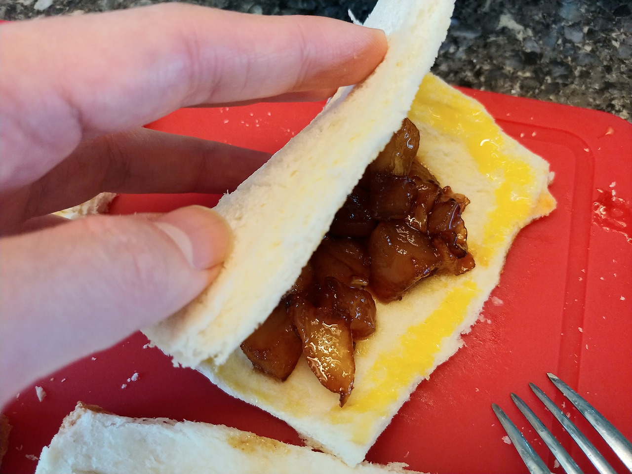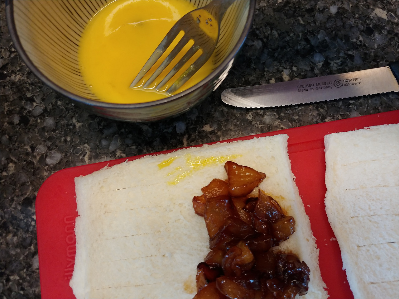 오늘은 내가 바로 하얀거팁 장준혁이다! 애플파이에 왜 계란이 필요하나. 봉합실, 아니, 봉합풀로 사용하기 위해서다. 식빵 쪼가리를 반으로 접어서 고정해야 하는데 그냥 접는다고 고이 접혀 알아러 붙을 리가 없다. 끈적한 계란물로 붙여주는 거다.