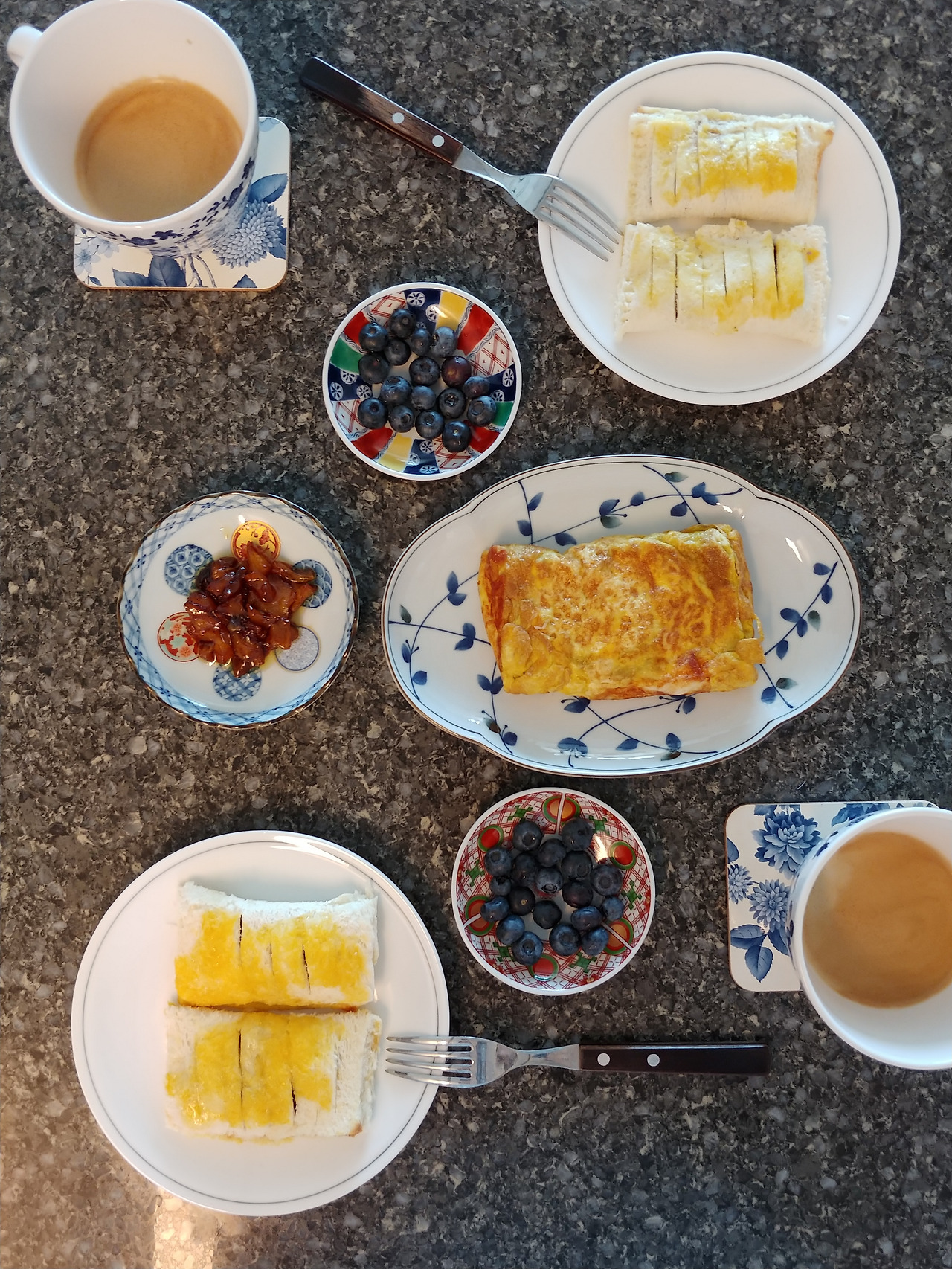 사진이 참 잘 나왔다. 배고픔을 참지 못한 아내가 그새 치즈 계란말이를 만들고 블루베리 몇 알을 꺼내서 세팅했다. 커피를 내리고 포크도 올려놓으니 제법 그럴싸하다. 뭔가 인스타스러워.