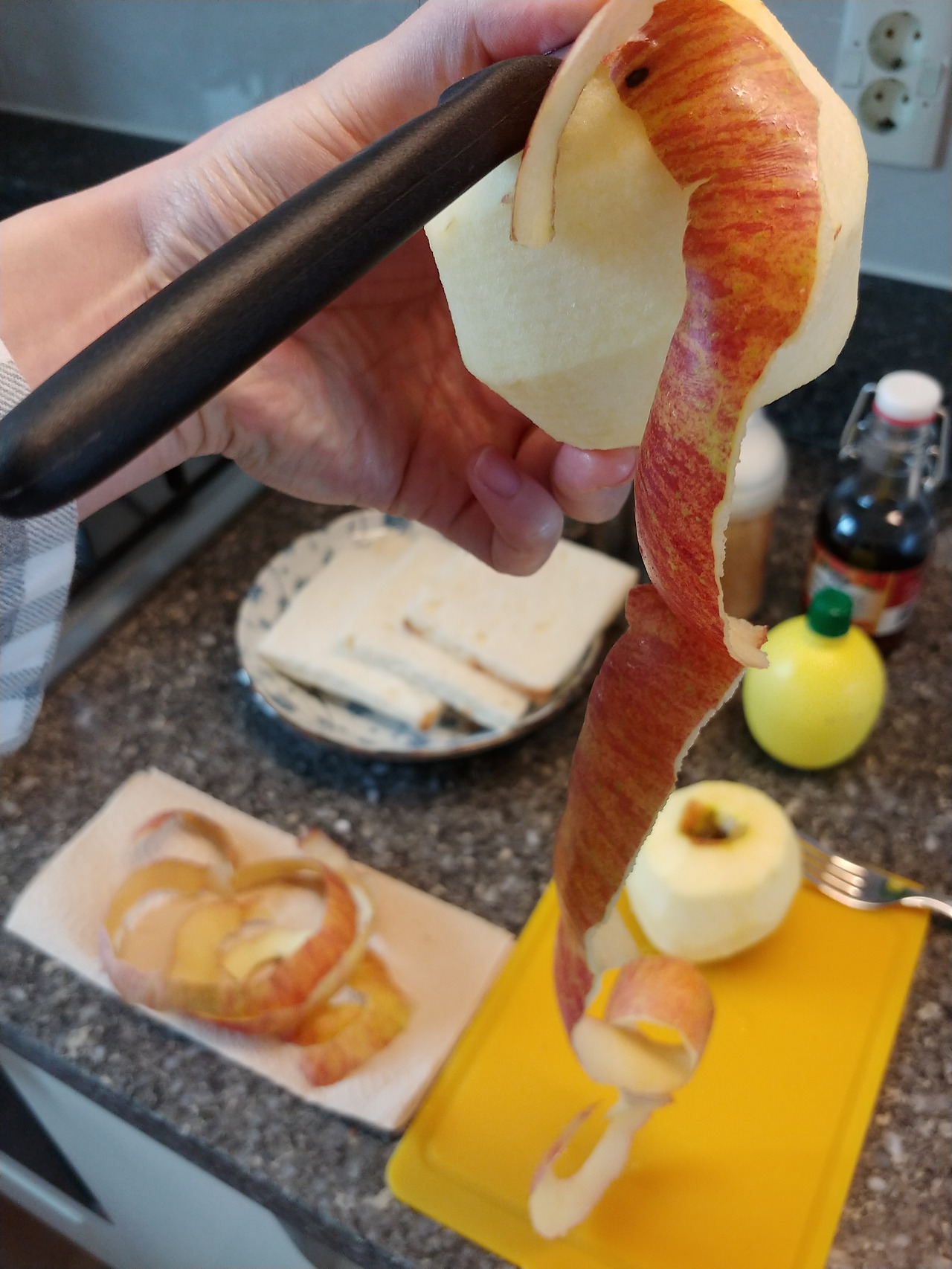 요리 초보지만 사과 깎기 하나만큼은 내가 아내보다 잘한다. 한 번도 끊기지 않고 한 번에 깎기 신공.