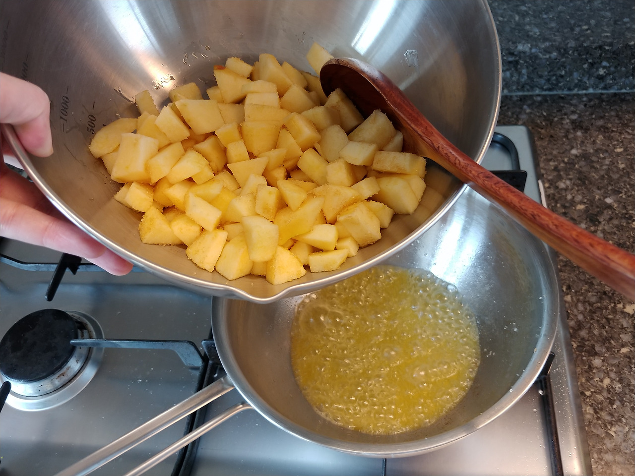 우선 버터를 팬에 둘러서 녹인 뒤 사과를 넣고 흑설탕을 듬뿍 뿌렸다. 이때부터 뭔가 좀 불안했다. 계량을 정확하게 해야한다 진짜. 요리 못하는 애들이 손대중이니 적당량이니 이런 말 하더라. 레시피라는 게 그냥 만들어진 게 아니다. 그런데 그 요리 못하는 애들 중 한 명이 바로 나일 줄이야. 대충 막 뿌렸더니 설탕이 너무 과하다. 으으, 너무 달아.