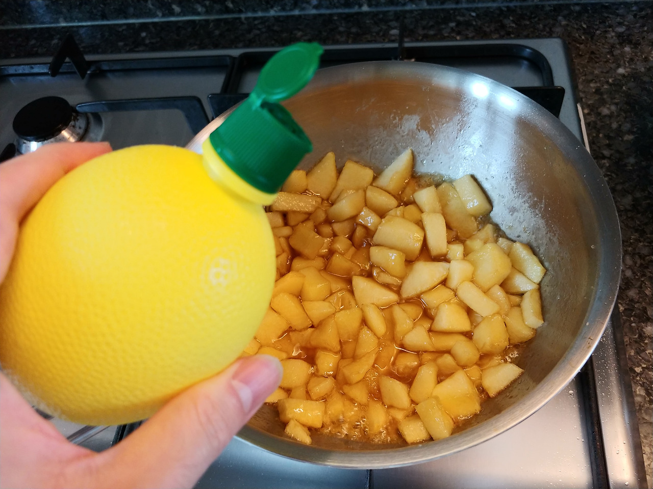 뭔가 허전하다 싶었는데 시나몬 가루가 없다. 이럴수가. 짜장면 시켰는데 면만 나오고 짜장이 없는 꼴 아닌가. 아니, 그 정도는 아니지. 애플파이니까 사과만 달달하게 잘 졸이면 되지. 시나몬 가루의 부재는 굳이 비유하자면 짜장면에 단무지가 빠진 정도라고 해 두자. 근데 단무지 없으면 짜장면 먹기 힘들긴 한데... 어쩔 수 없다. 대신 상큼한 맛을 내보려고 레몬즙도 살짝 뿌려줬다.
