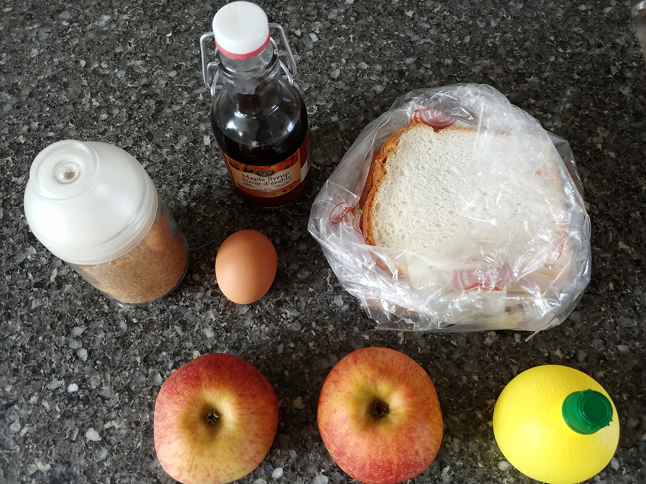 애플파이의 재료는 간단하다. 이번 요리는 반죽을 직접 하지 않으므로 더욱 간단해졌다. 반죽 대신 식빵을 쓴다. 애플파이니까 당연히 사과도 있어야지. 우리는 무한도전에서의 '홍철없는 홍철팀' 따위가 아니니까. 그리고 흑설탕, 계란, 버터, 시나몬가루, 기호에 따라 레몬즙과 시럽까지.