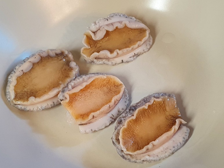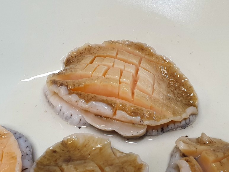이제 겨우 재료 손질만 끝났을 뿐. 다음으로는 요리를 할 차례다. 어디서 본 건 있어서 칼집을 예쁘게 냈다. 가로 세로 날줄과 씨줄 무늬처럼 스윽 스윽 스윽. 분명 전복 손질 중인데 갑자기 벌집 삼겹살이 땡긴다.