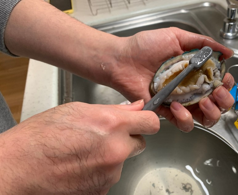 그런데 나도 전복 손질이라는 걸 평생 해 본 적이 없는데? 인터넷에 찾아보니 솔이나 칫솔로 박박 문질러야 된단다. 뭘 그렇게까지 해야하나, 궁시렁거리면서 칫솔질을 해 봤는데 꼬질꼬질한 때가 한가득 벗겨진다. 씻기 전의 전복은 엄청 더러운 아이였구나.