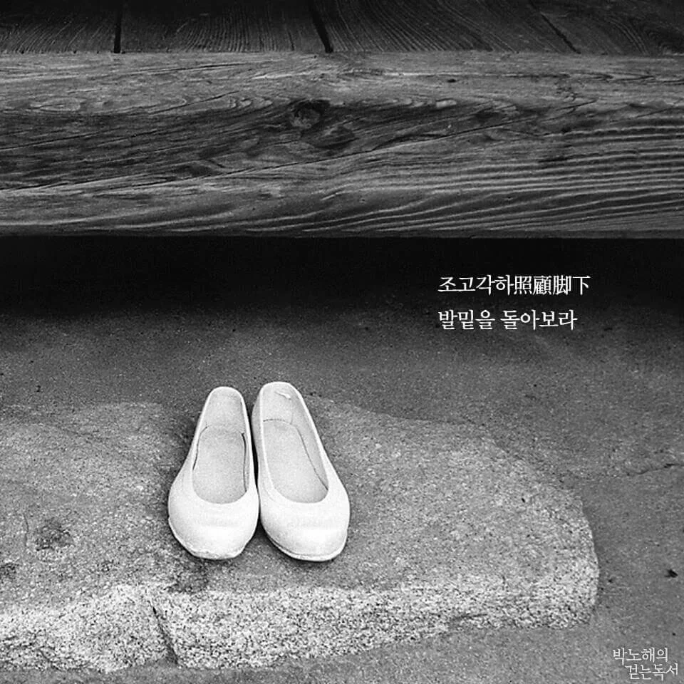 절에 가면 신발을 벗어놓는 섬돌 위에 ‘조고각하照顧脚下’라고 쓰인 주련이 걸려 있다. 신발을 바르게 벗어 놓으라는 뜻도 되지만 본질적으로 지금 자기가 서 있는 자리를 살펴보라는 것이다. 하지만 매 순간 깨어 자신을 살피는 일은 생각만큼 그리 쉽지 않다. 어떤 날은 정신없이 하루를 보내고 귀가하면 오늘 하루를 어떻게 보냈는지 머리가 멍할 때가 있다. 그럴 때 가슴이 철렁 내려앉는다. ‘정신이 나가 있었구나!’