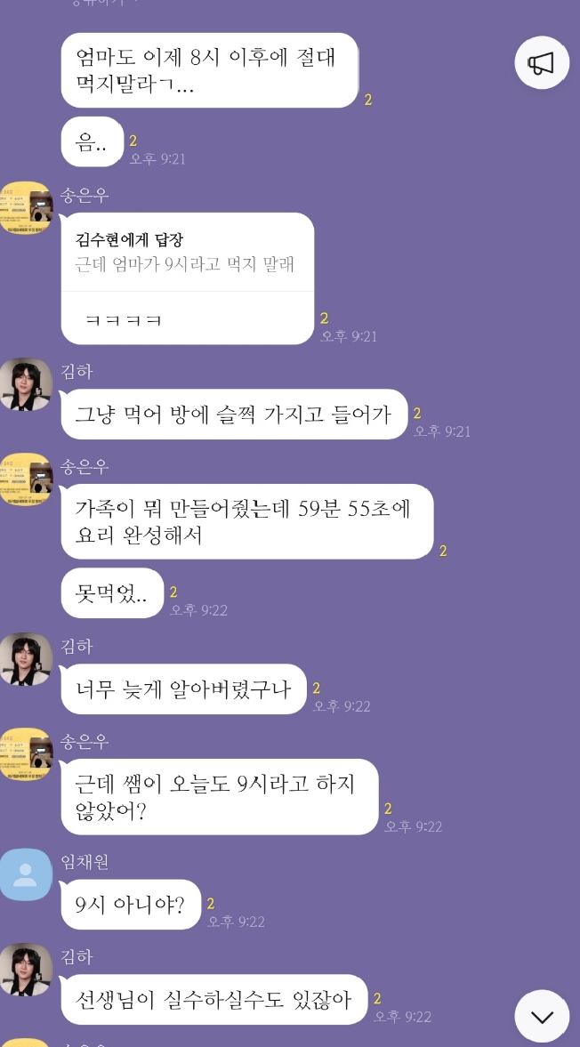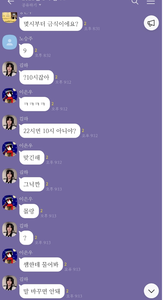 밤부터 끊임없는 ‘카톡, 카톡...’ 소리에 반톡을 보니 금식 시간이 9시냐, 10시냐로 공방전이 벌어졌다. ‘선생님의 실수다’, ‘그럴 분이 아니다’로부터 ‘벌써 먹었는데 어떻게 하느냐’, ‘큰일 났다.’ 등등 결론이 안 나는 대화를 끊임없이 하고 있었다. 뾰족한 수가 없는지 ‘선생님한테 물어보자’는 아이도 있었다.