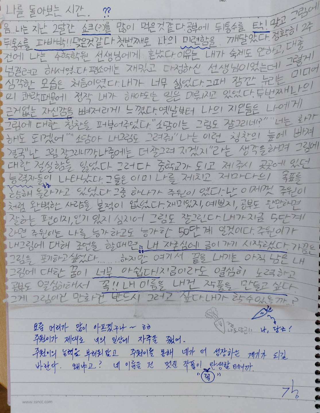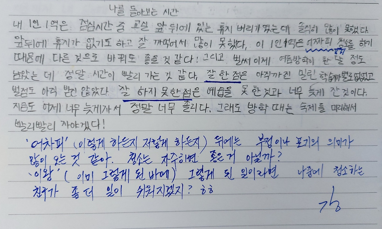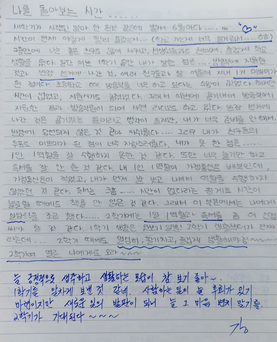 “지난 3개월 동안 내가 정한 목표를 잘 지키고 있다고 생각했는데 다시 생각해 보니 초반에는 지키고 한 달 정도 지나고 다시 예전의 나로 돌아간 것 같다. 2학기부터라도 초심을 찾고 다시 목표를 이루도록 노력해야겠다.”